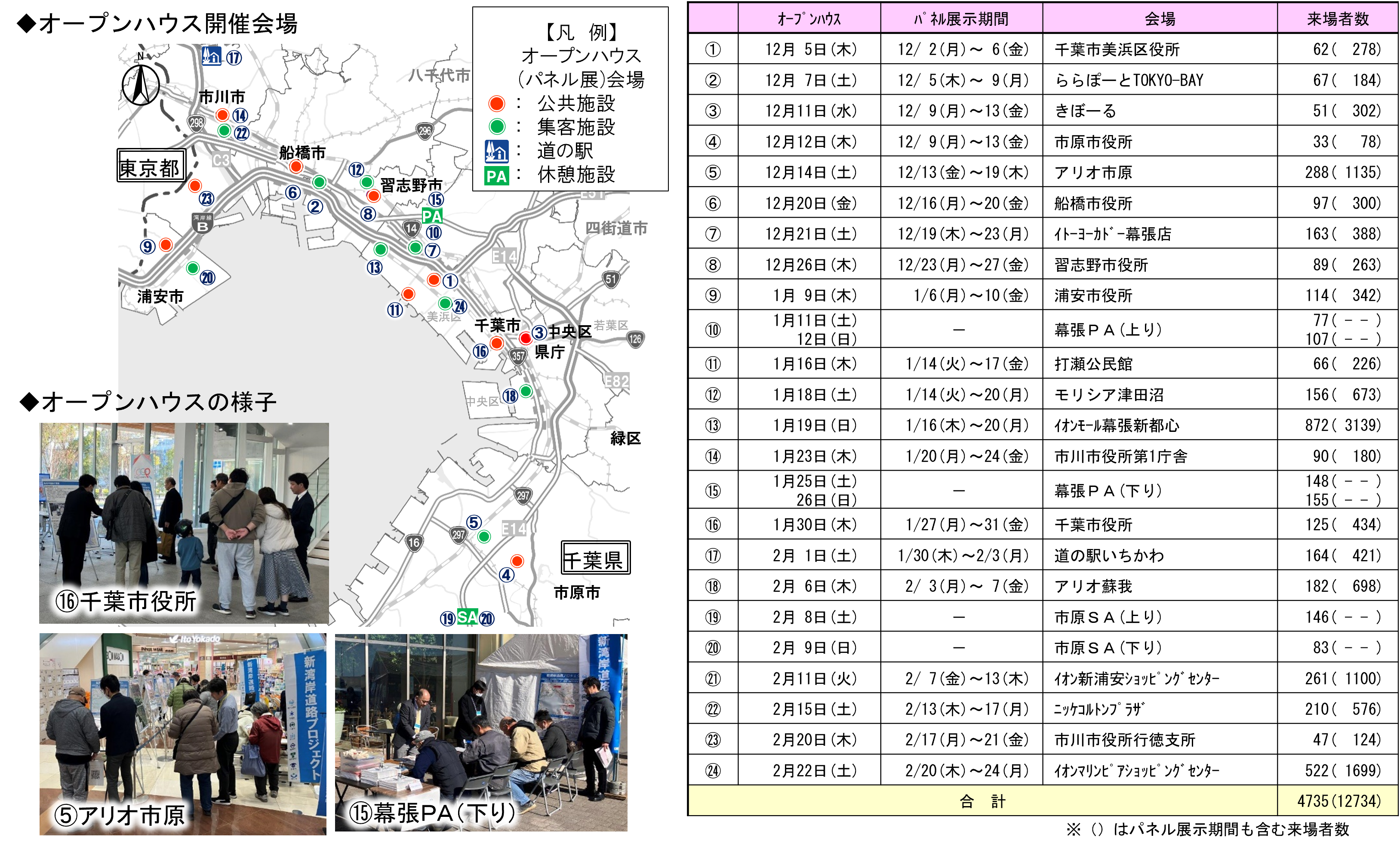 第1回コミュニケーション活動では、皆様のご意見を幅広くお聞きする場として、「オープンハウス(パネル展示を中心とした情報提供)」を令和6年12月2日~令和7年2月24日にかけて、沿線市役所(千葉市、市川市、船橋市、習志野市、市原市、浦安市)や、沿線に立地する集客施設、道の駅等、計24箇所で開催し、情報提供と意見聴取を行いました。
