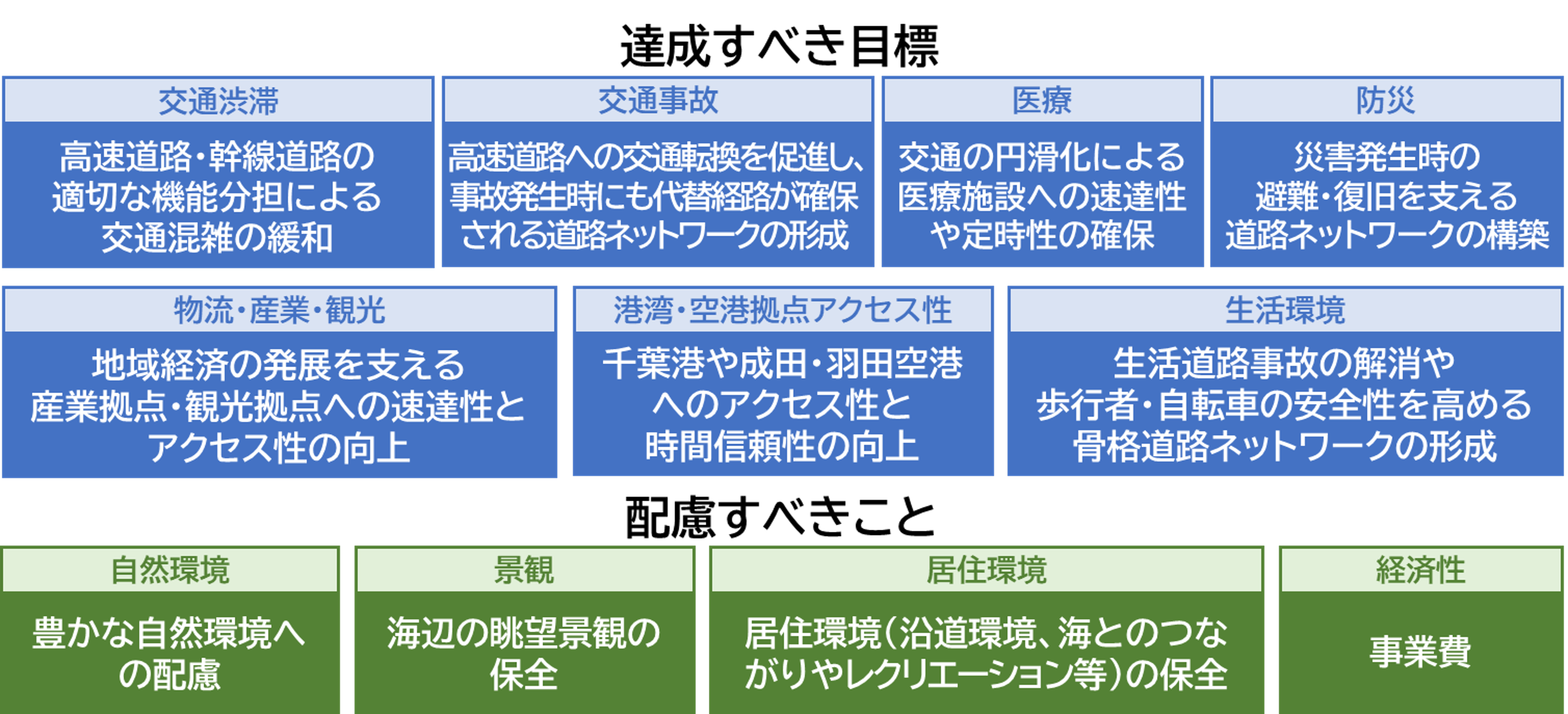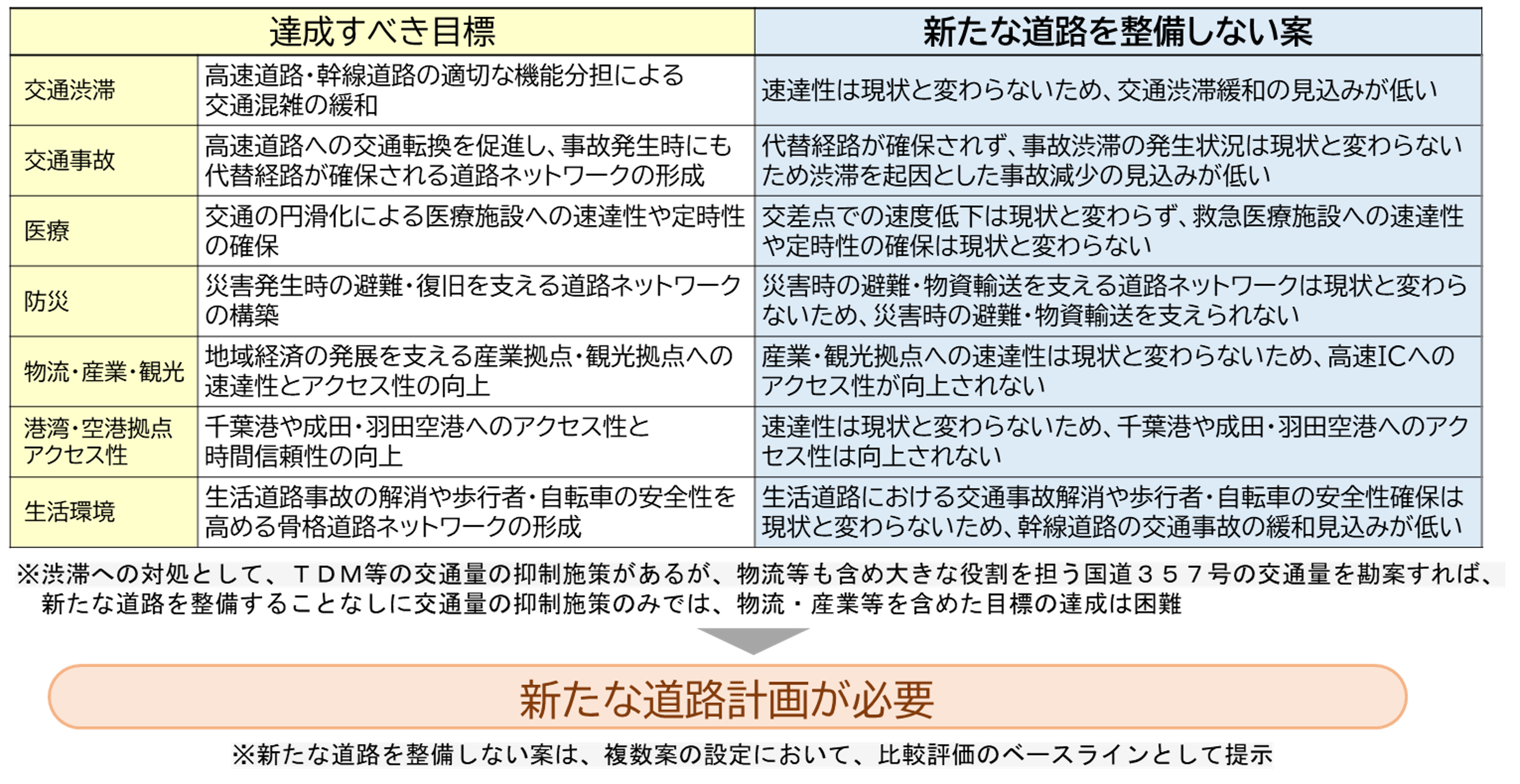 湾岸地域における「達成すべき目標」を達成するためには、新たな道路計画の検討が必要であり、新湾岸道路有識者委員会でも了承が得られています。