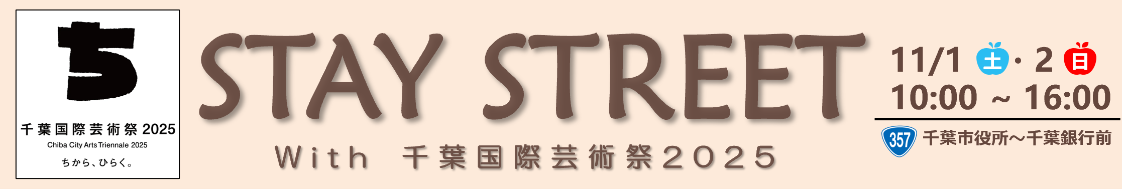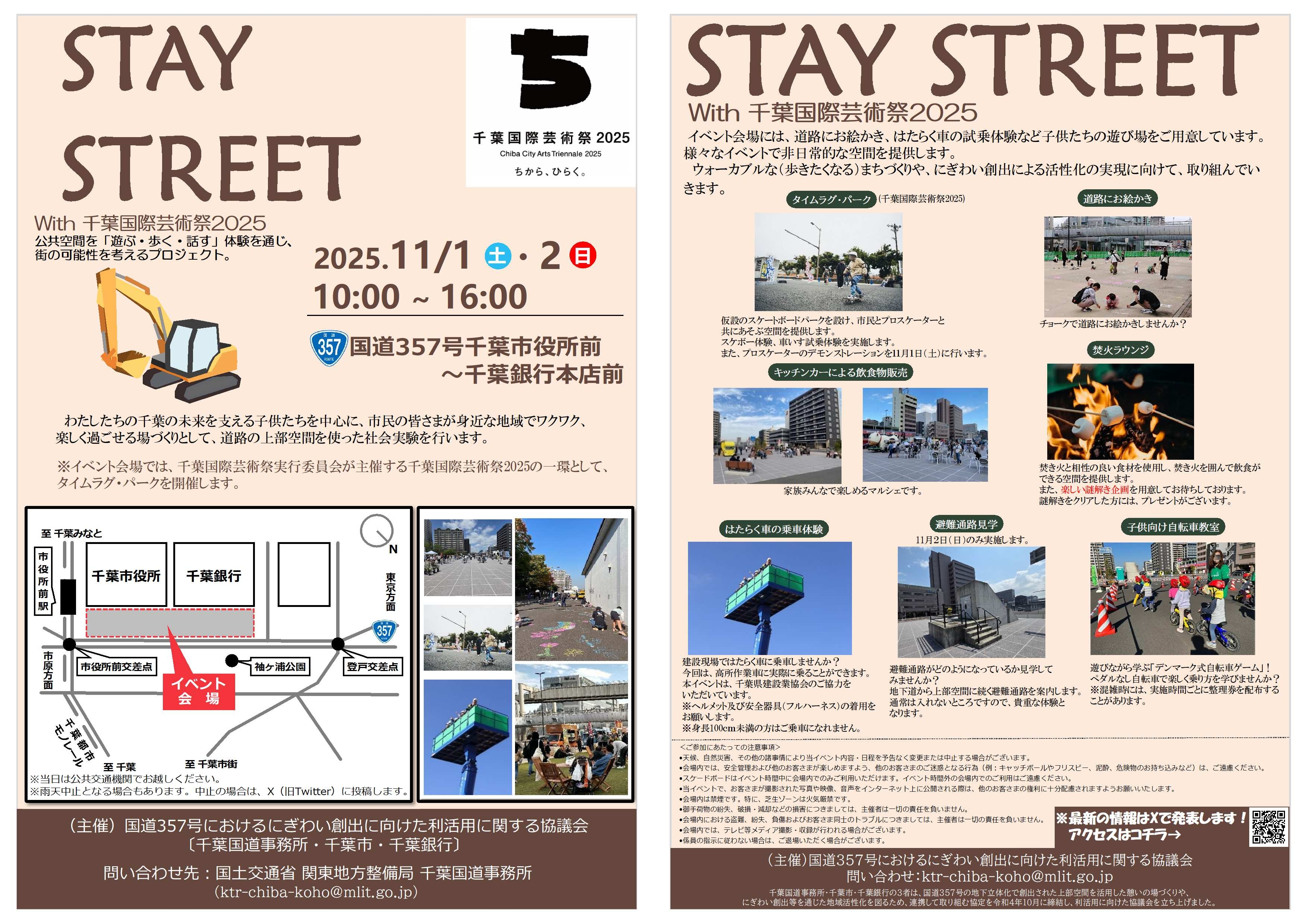 ・\STAY STREET 開催決定!/国道357号の空間を活用した千葉市役所・千葉銀行本社前の社会実験イベント「STAY STREET」を11/1(土)、11/2(日)に開催します!様々な催しをご用意して皆さまのご来場お待ちしています。是非、ご参加ください。・\再来週は STAY STREET!/STAY STREETでは道路に思い思いの絵を描くことができます!道路をキャンバスに5色のチョークを使って、思い思いの絵を描いてみませんか?