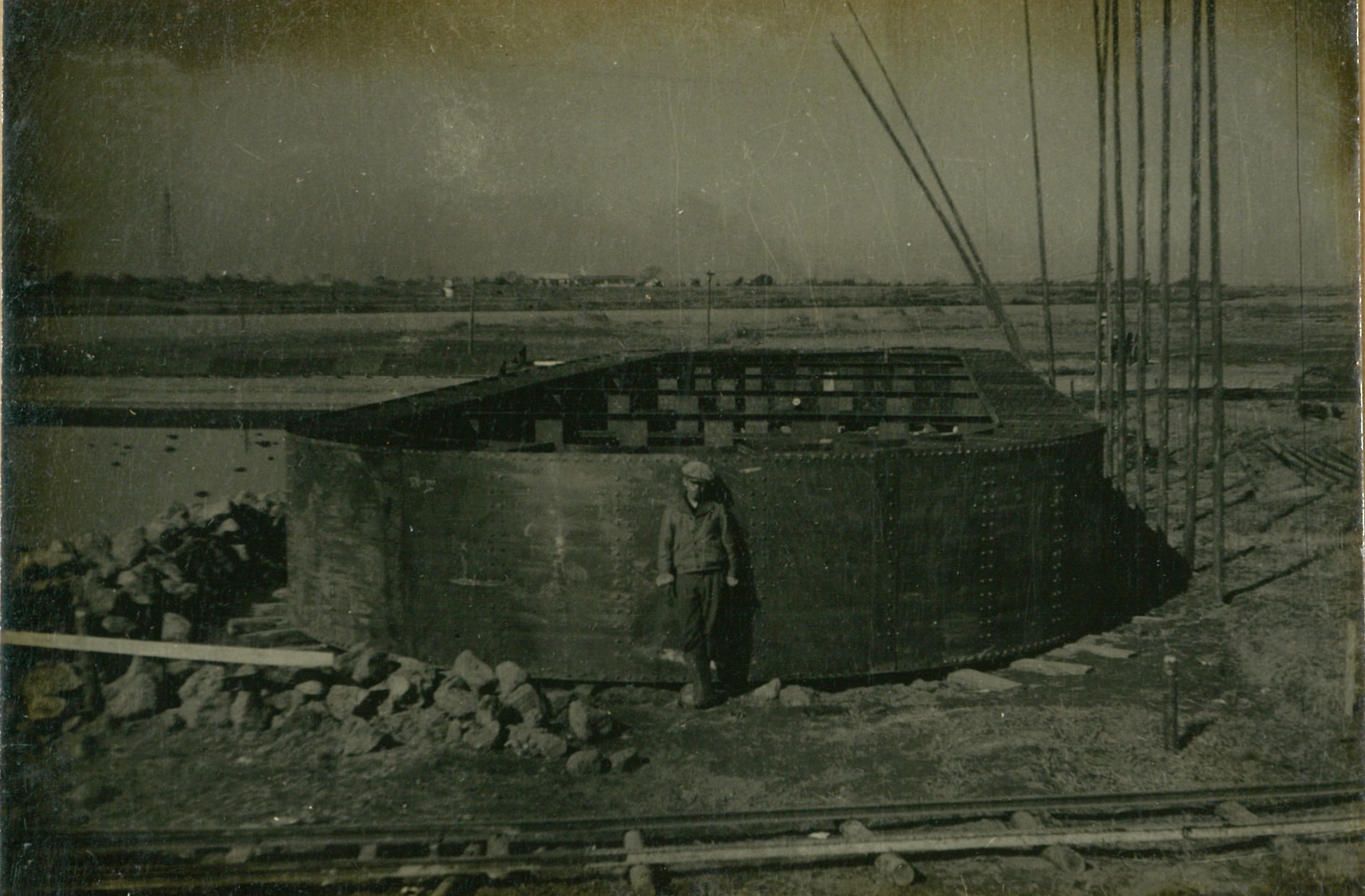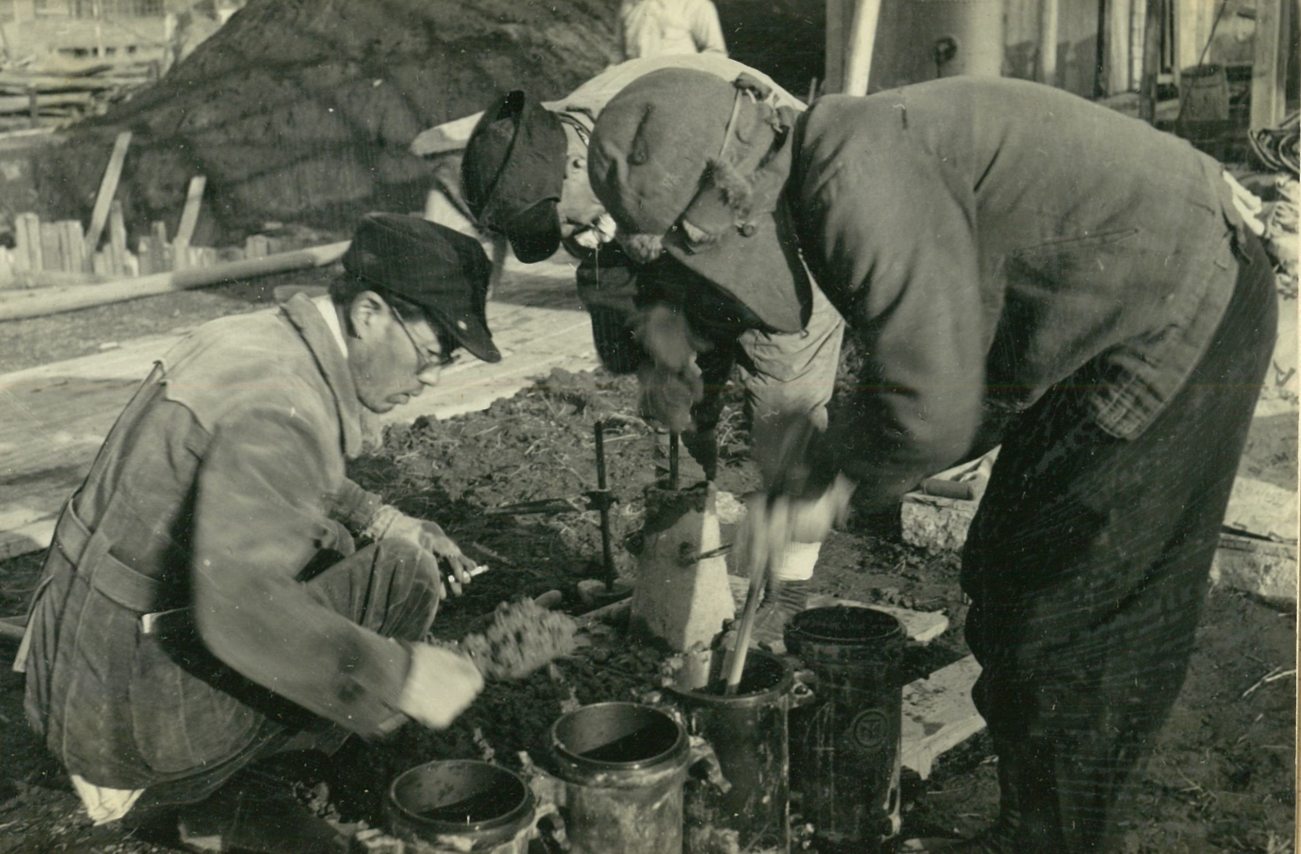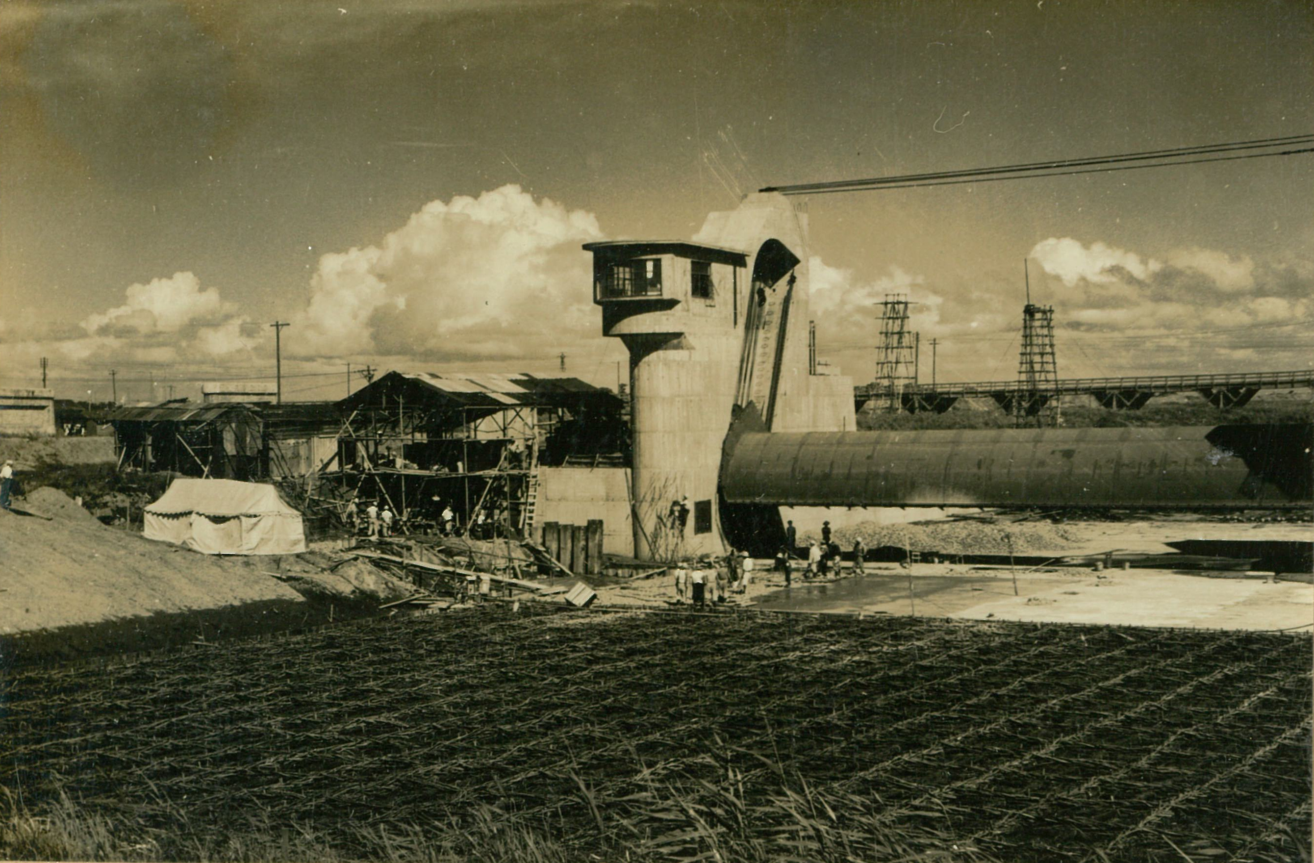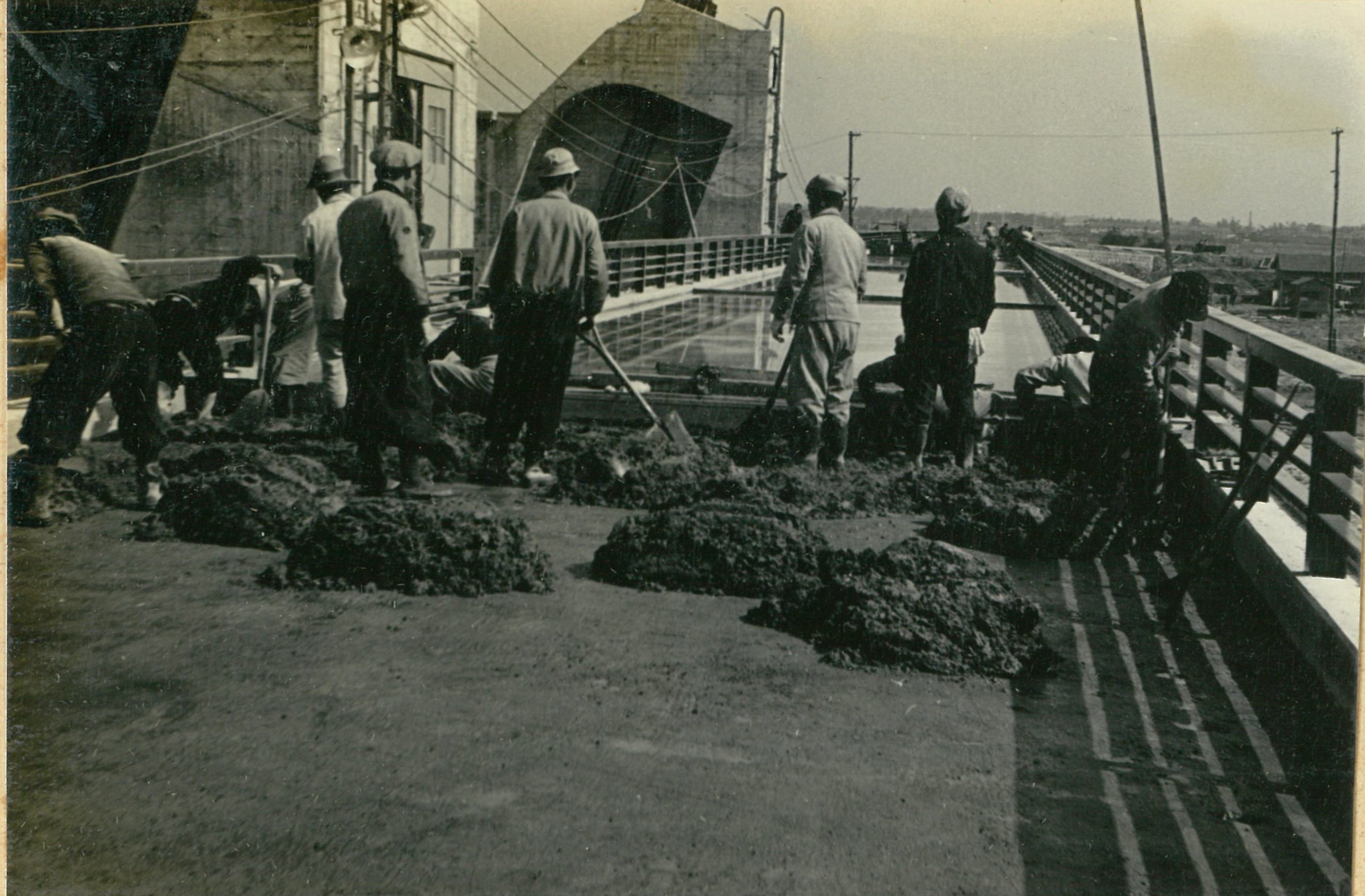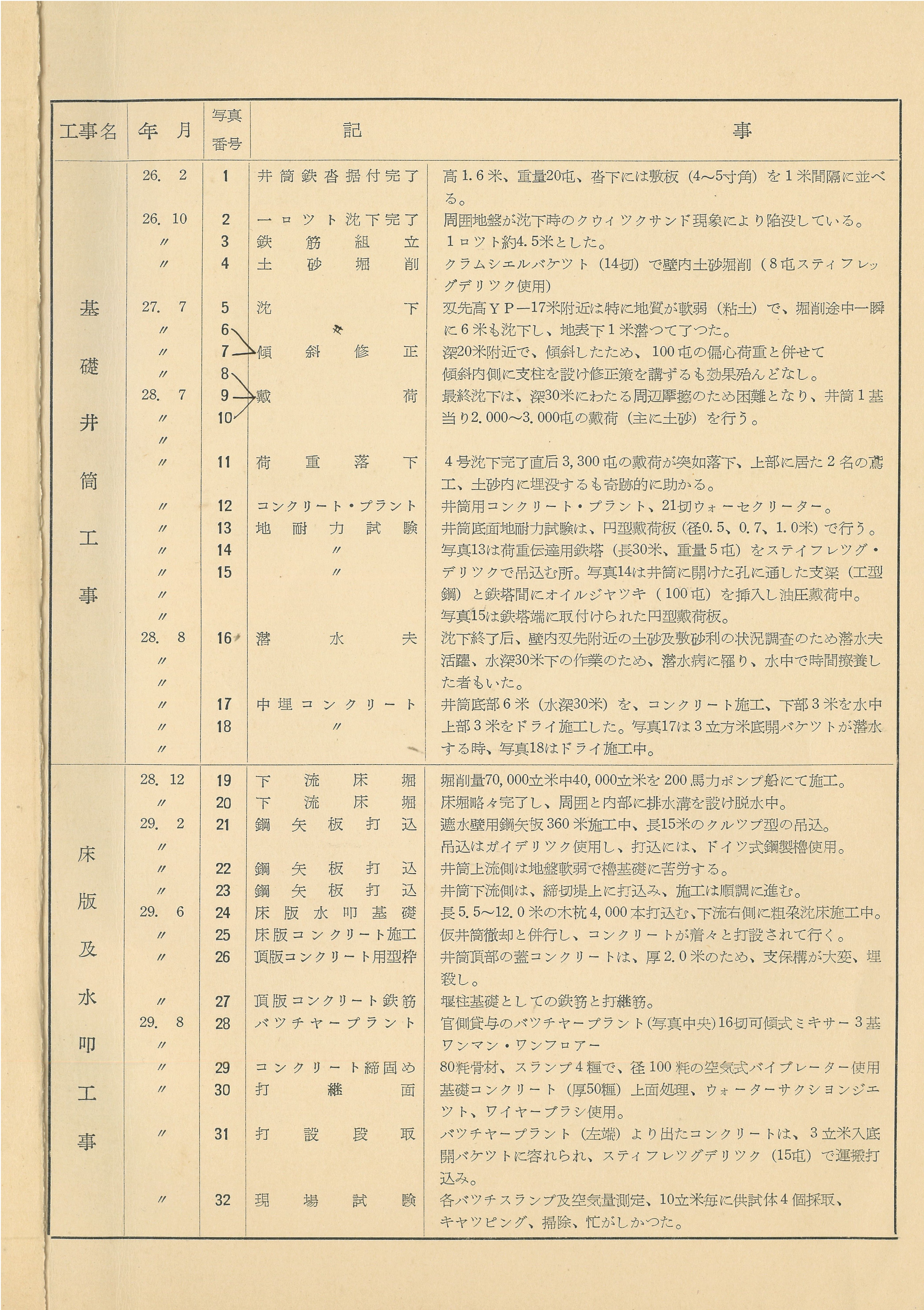 説明最終沈下は、深30米にわたる周辺摩擦のため困難となり、井筒1基当り2.000~3.000屯の戴荷(主に土砂)を行う。