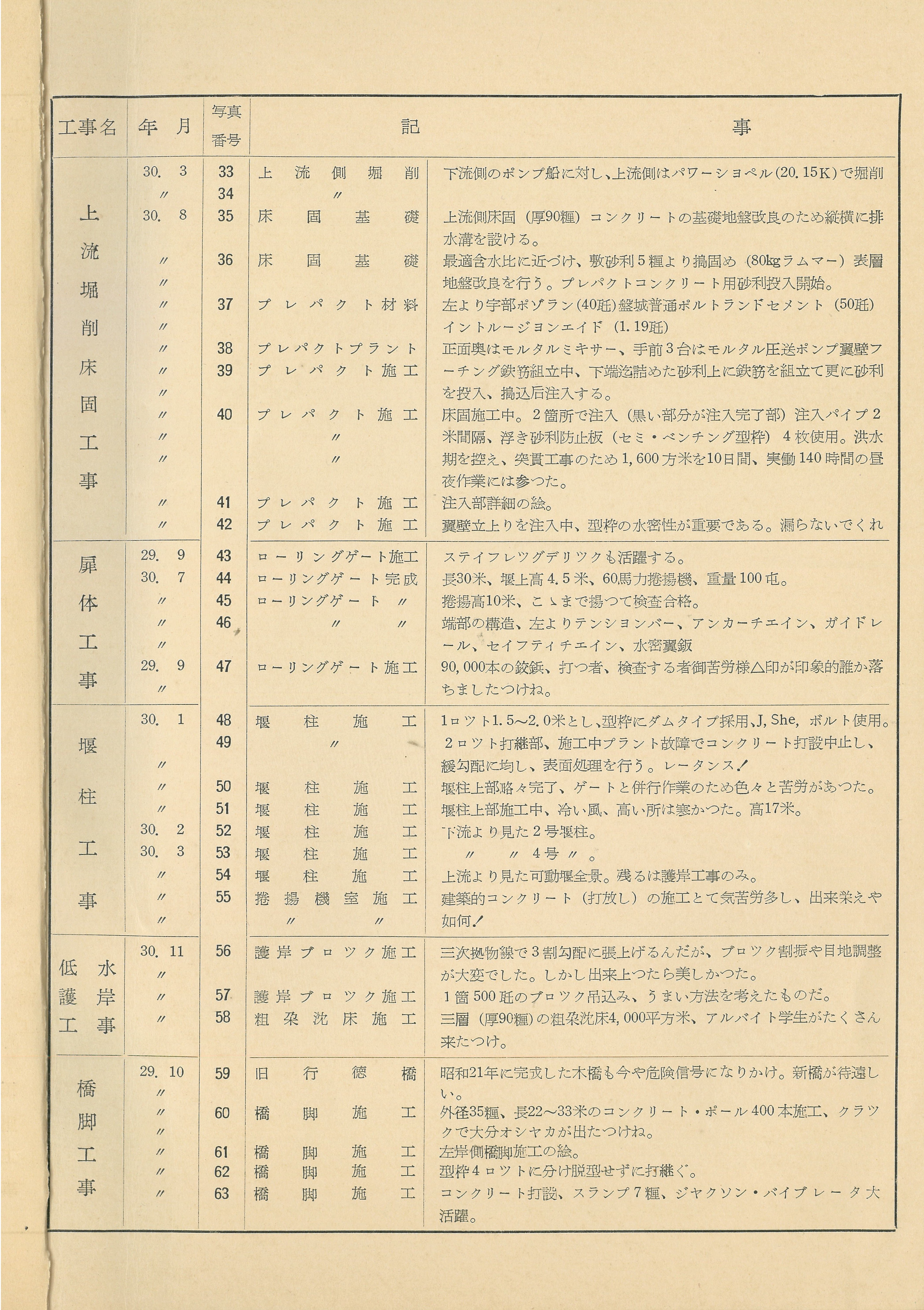 説明1ロツト1.5~2.0米とし、型枠にダムタイプ採用、J,She,ボルト使用。2ロツト打継部、施工中プラント故障でコンクリート打設中止し、緩勾配に均し、表面処理を行う。レータンス!