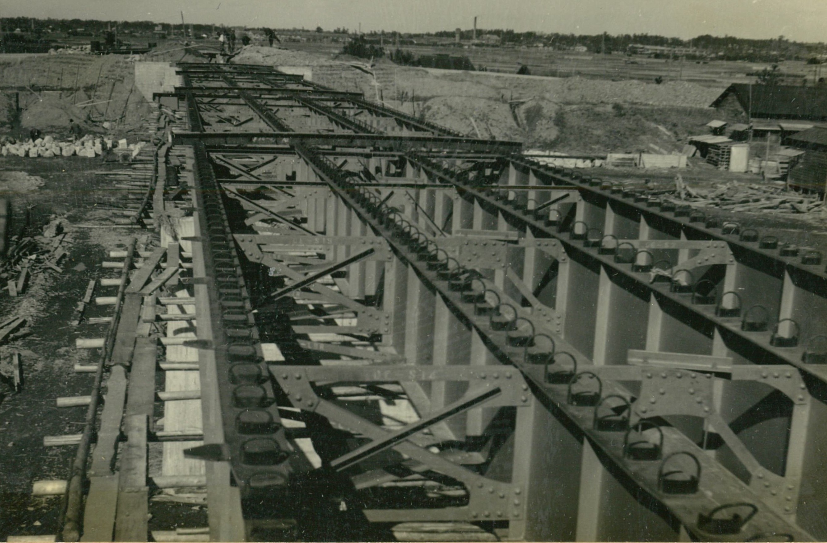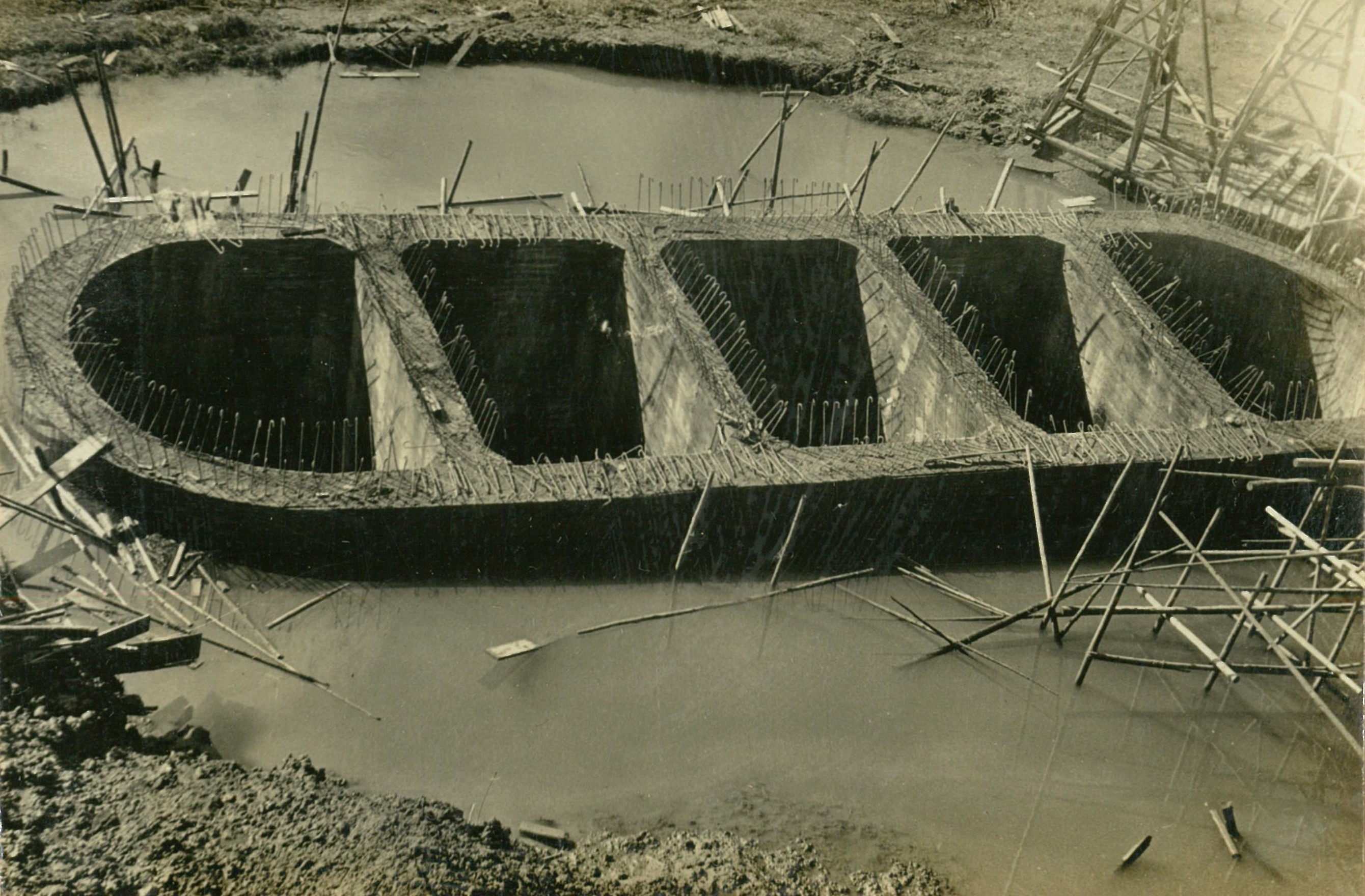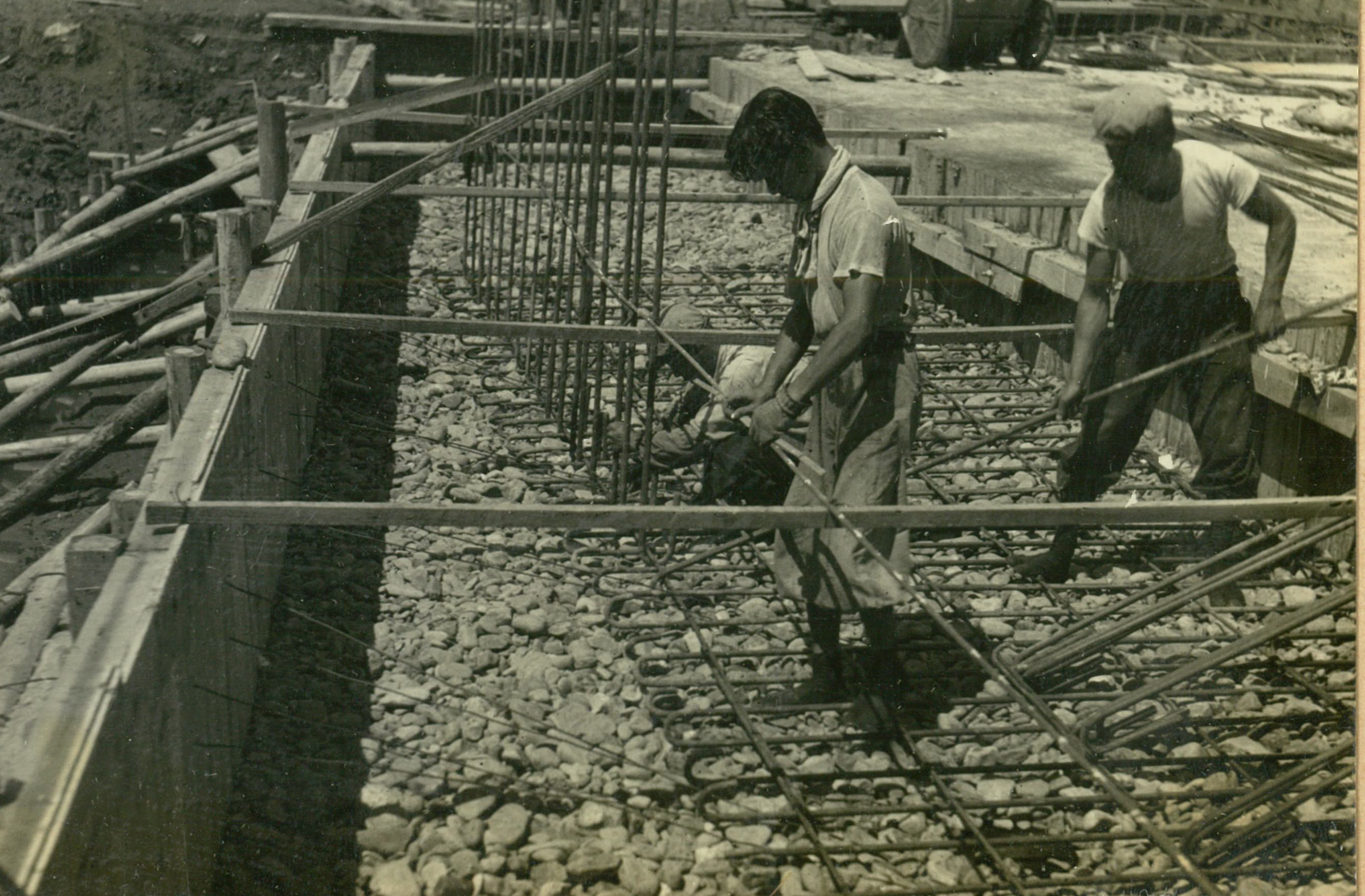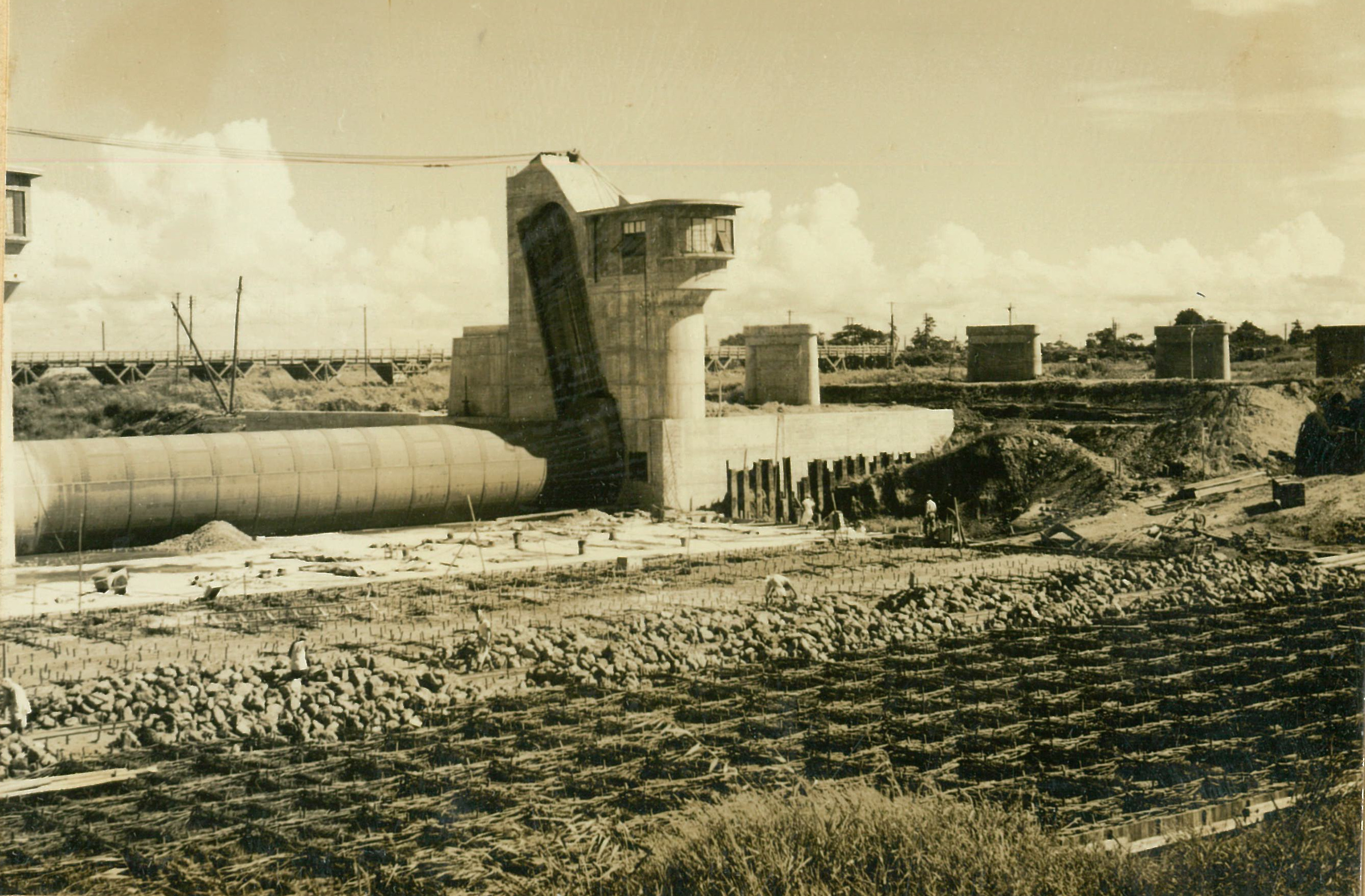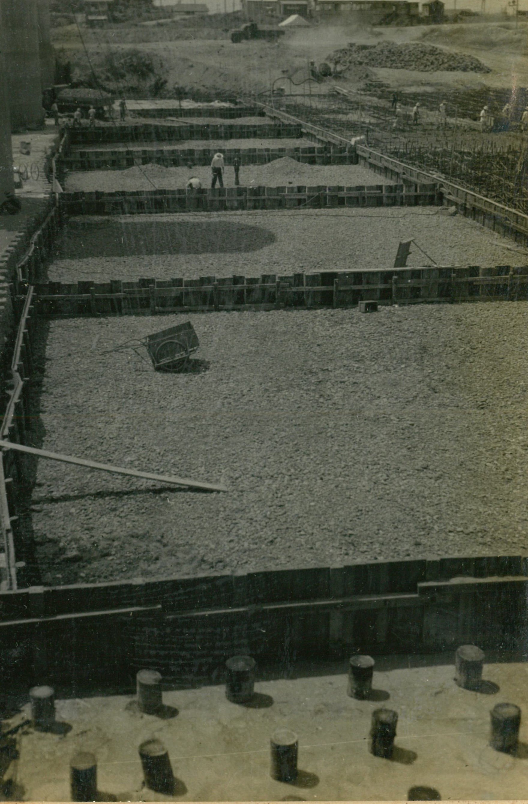 説明正面奥はモルタルミキサー、手前3台はモルタル圧送ボンプ翼壁フーチング鉄筋組立中、下端迄詰めた砂利上に鉄筋を組立て更に砂利を投入、搗込后注入する。