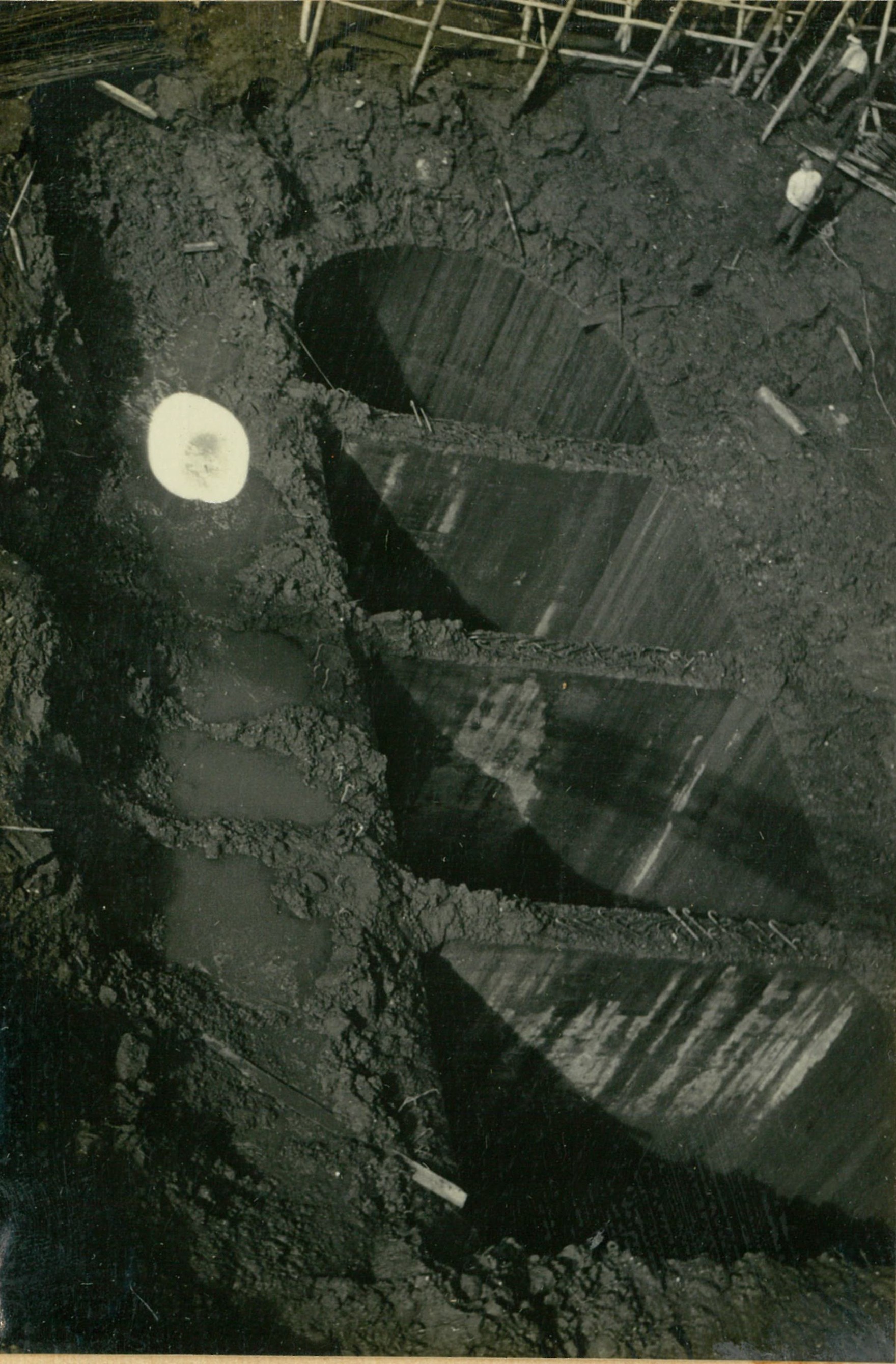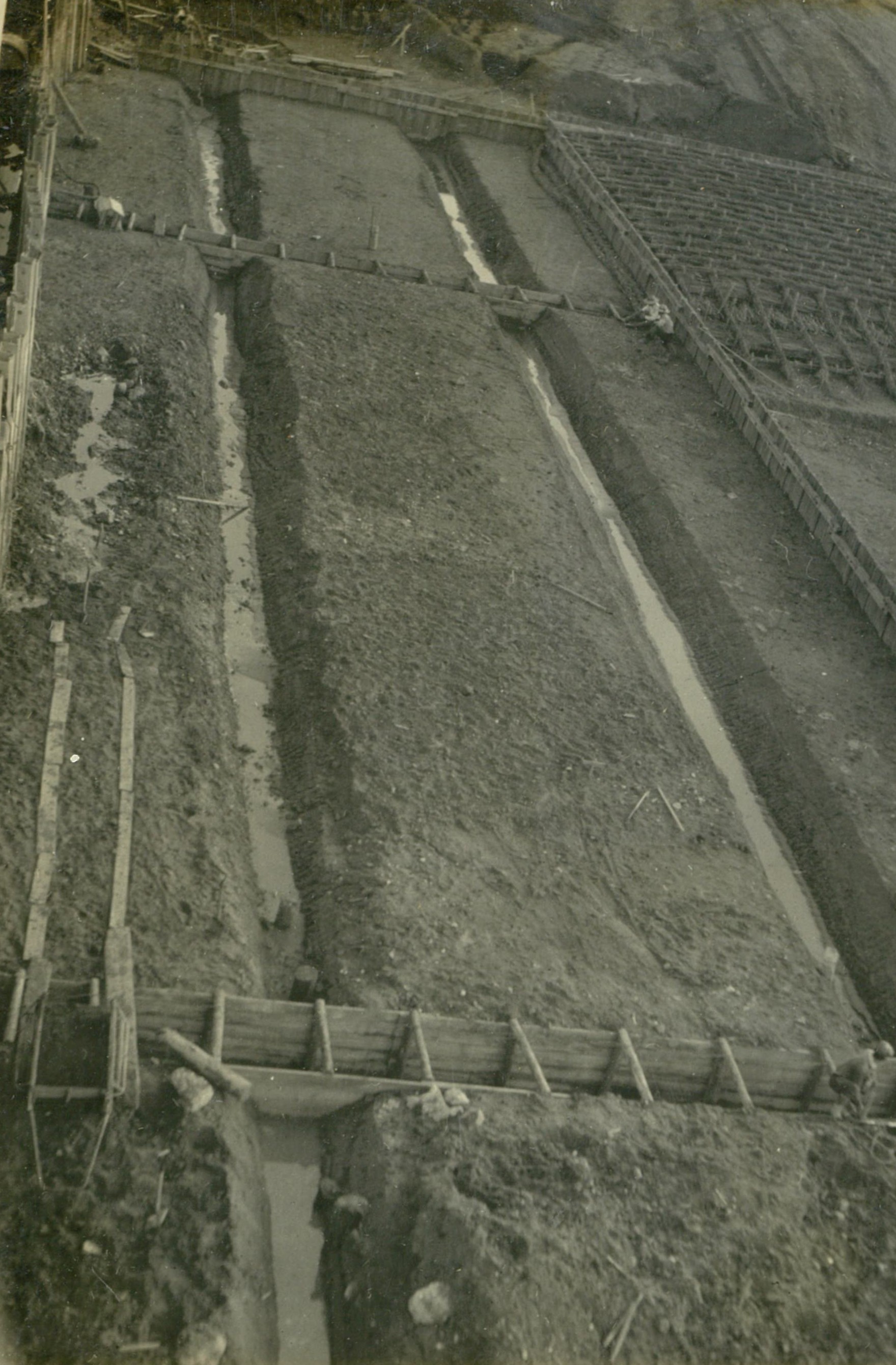 説明床堀略々完了し、周囲と内部に排水溝を設け脱水中。
