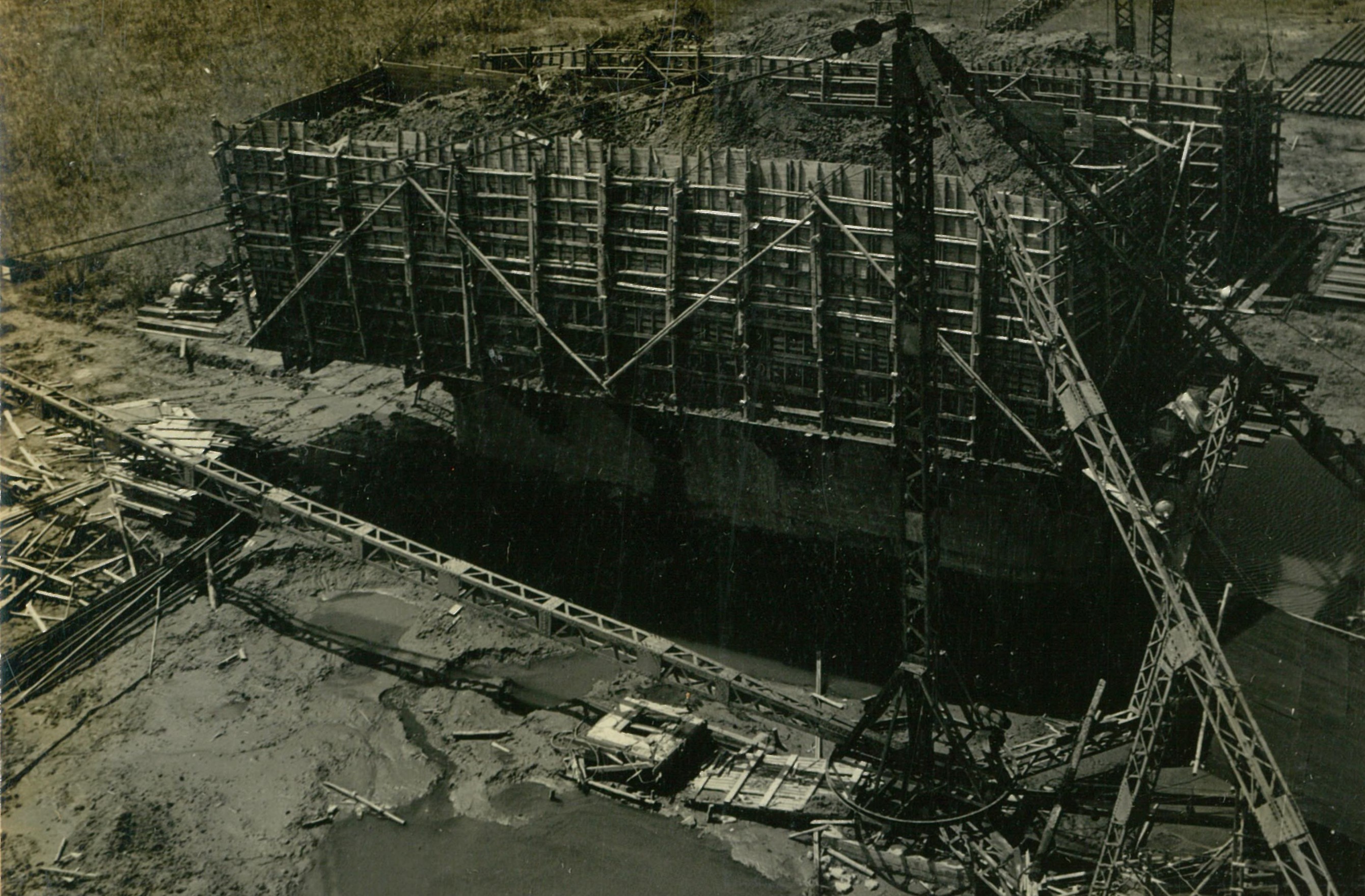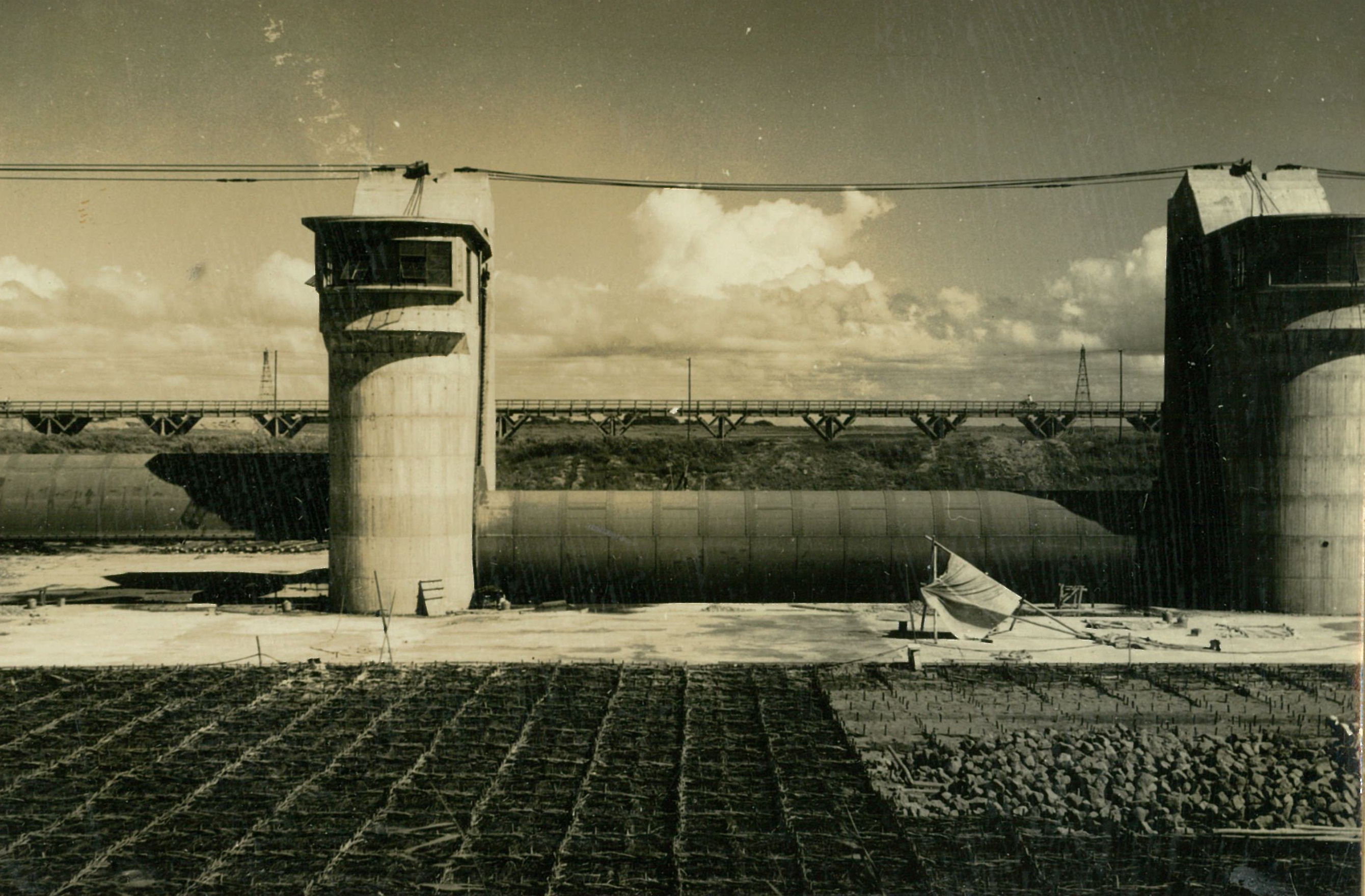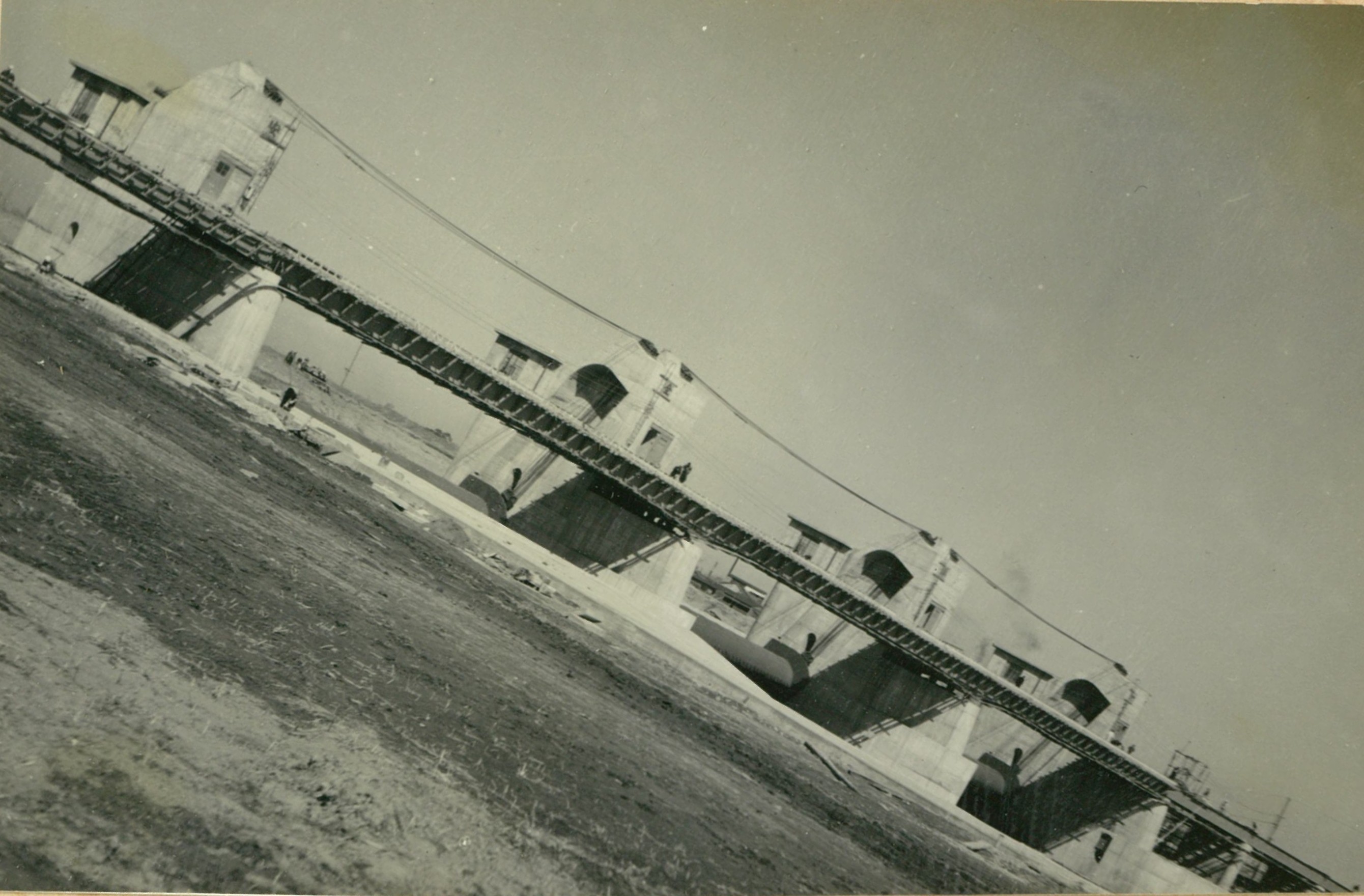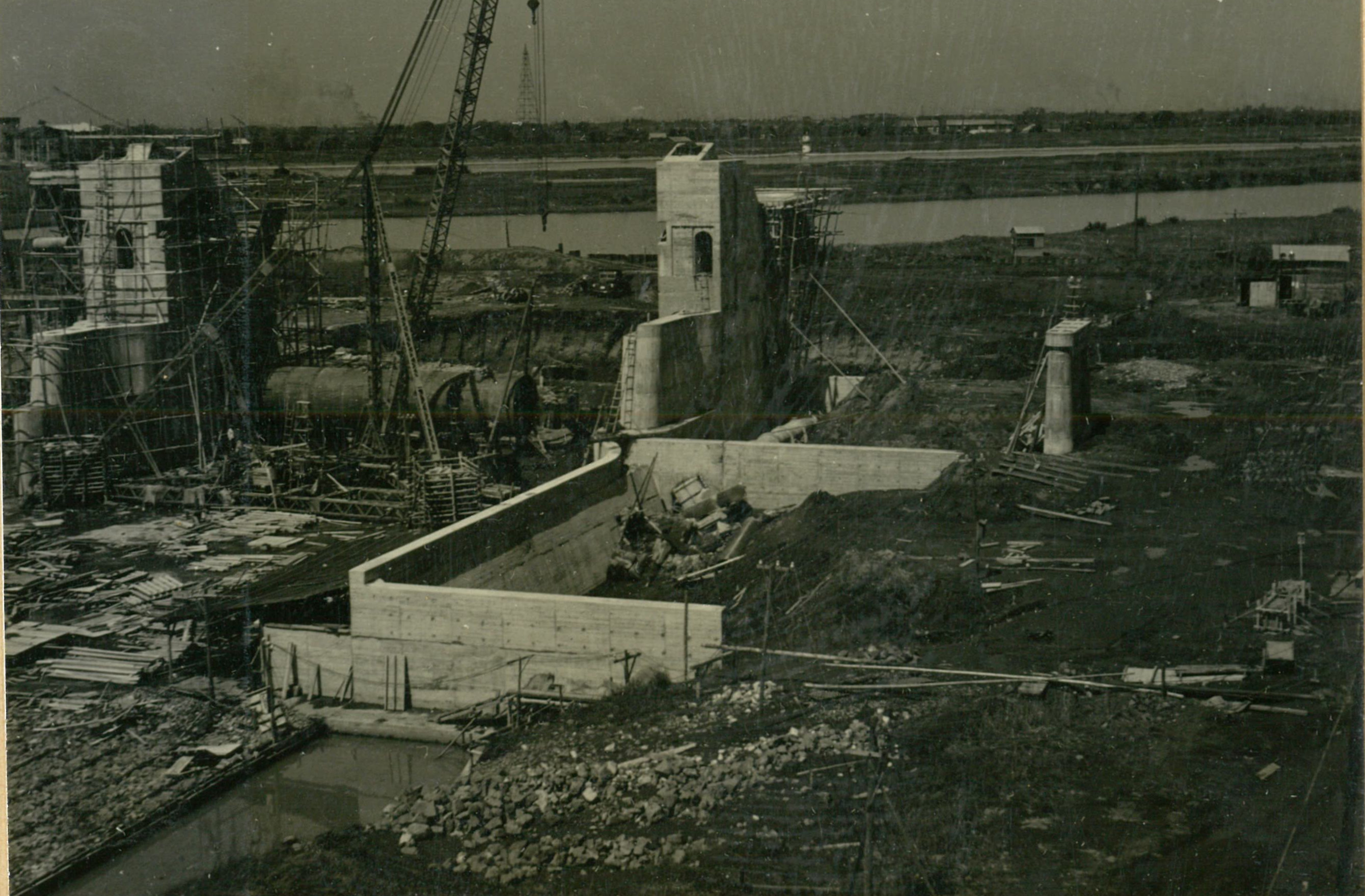 説明堰柱上部略々完了、 ゲー トと併行作業のため色々と苦労があつた。