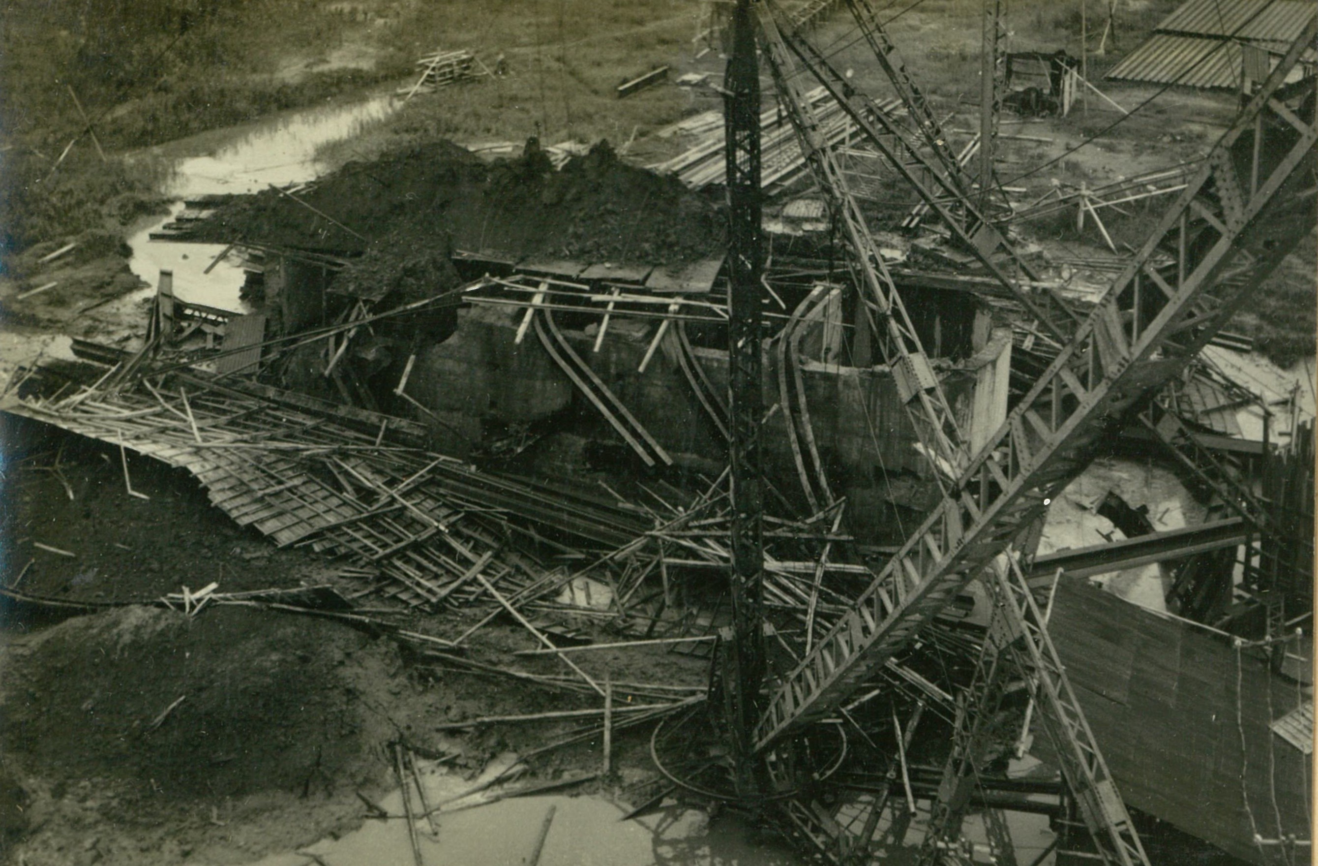 説明4号沈下完了直后3,300屯の戴荷が突如落下、上部に居た2名の鳶工、土砂内に埋没するも奇跡的に助かる。