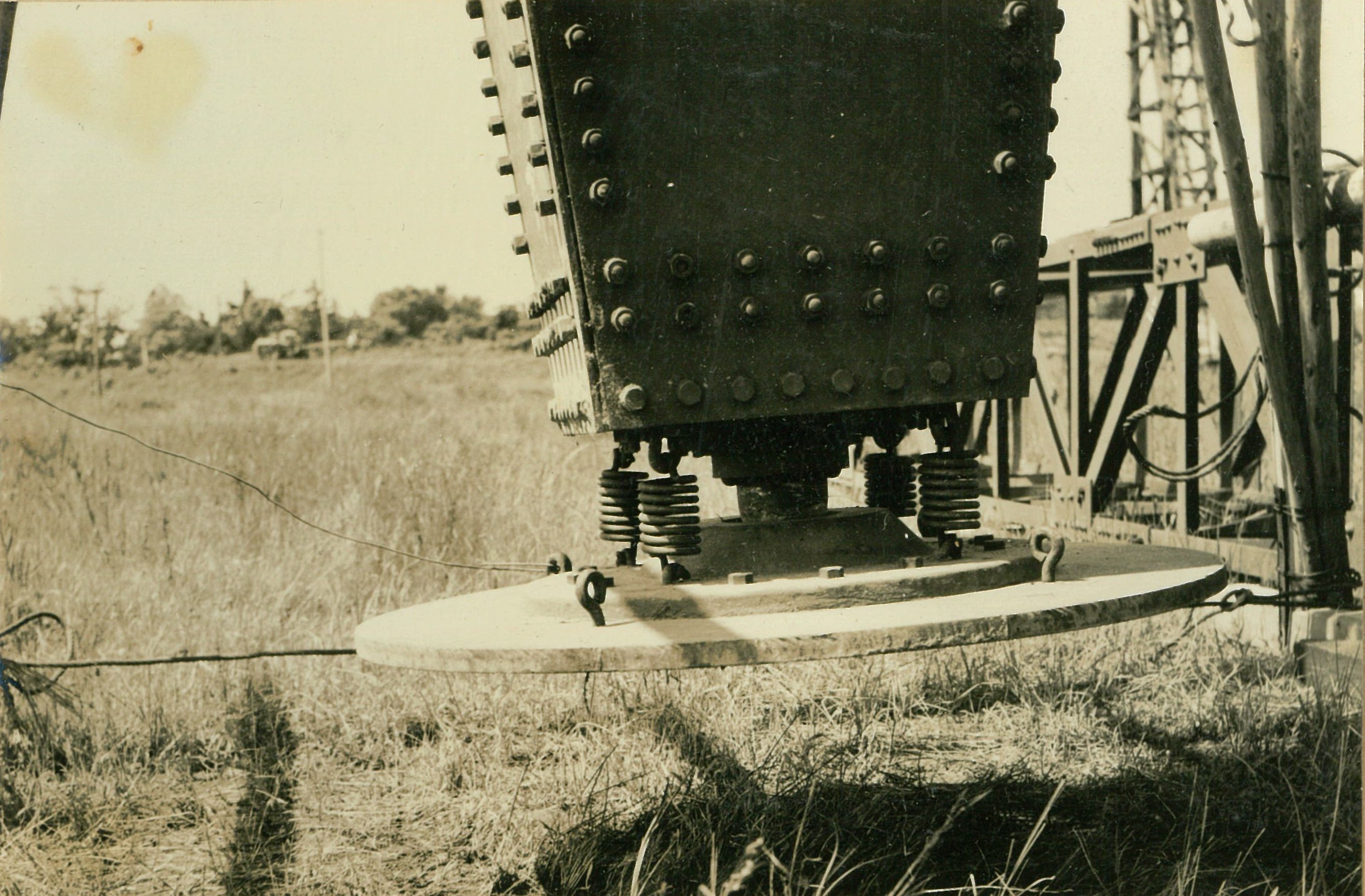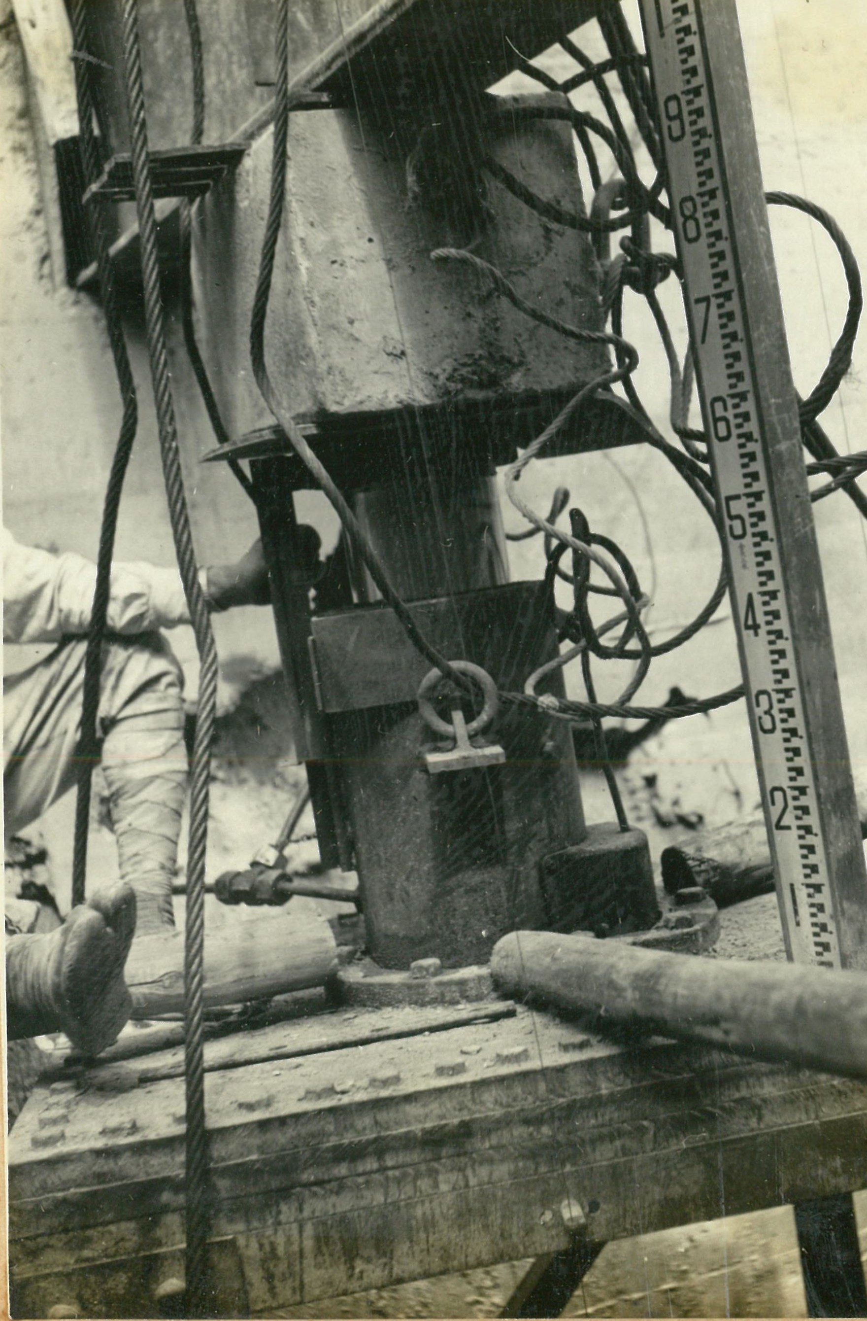 説明井筒底面地耐力試験は、円型戴荷板(径0.5、0.7、1.0米)で行う。写真13は荷重伝達用鉄塔(長30米、重量5屯)をステイフレツグ・デリツクで吊込む所。