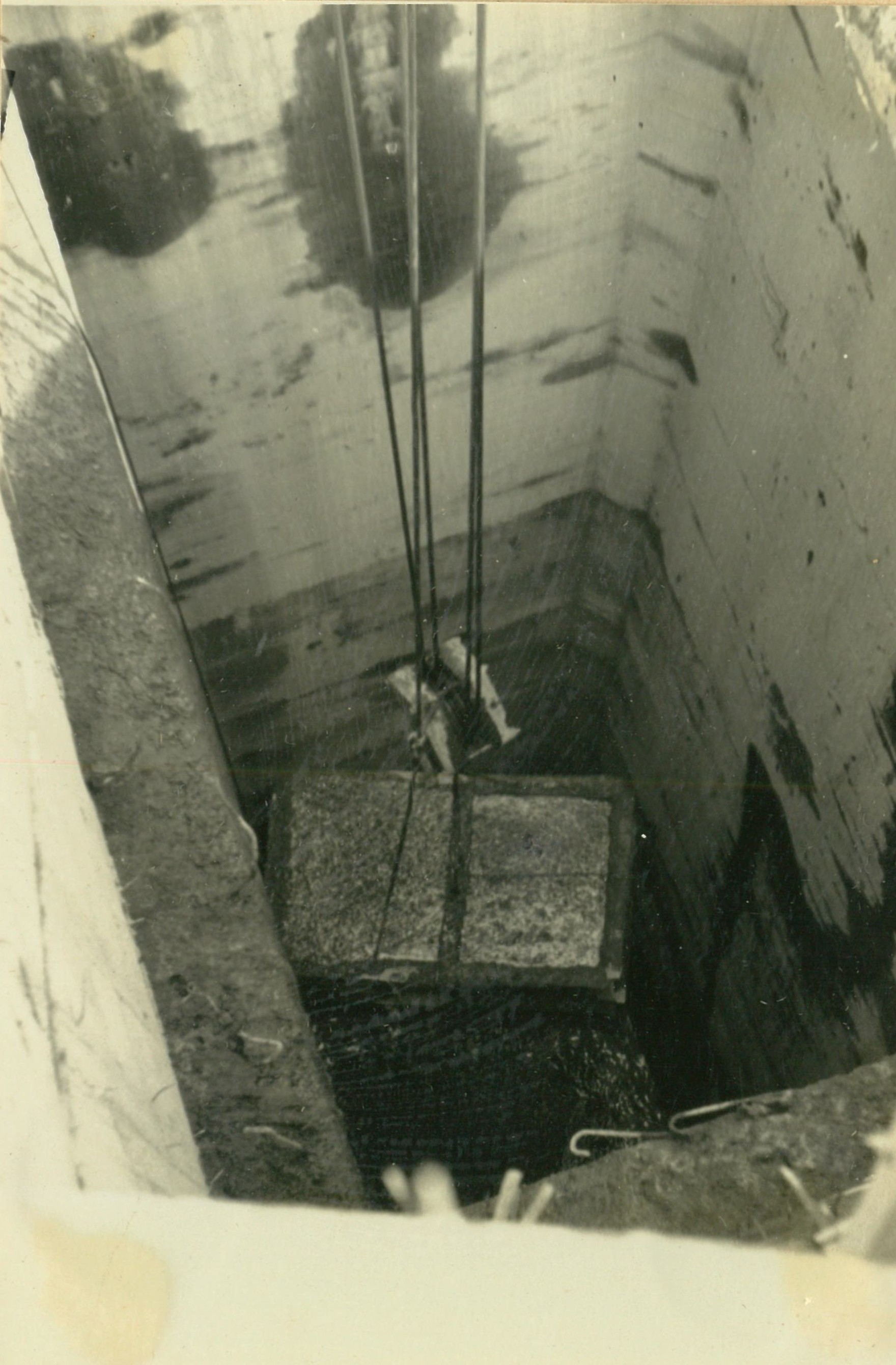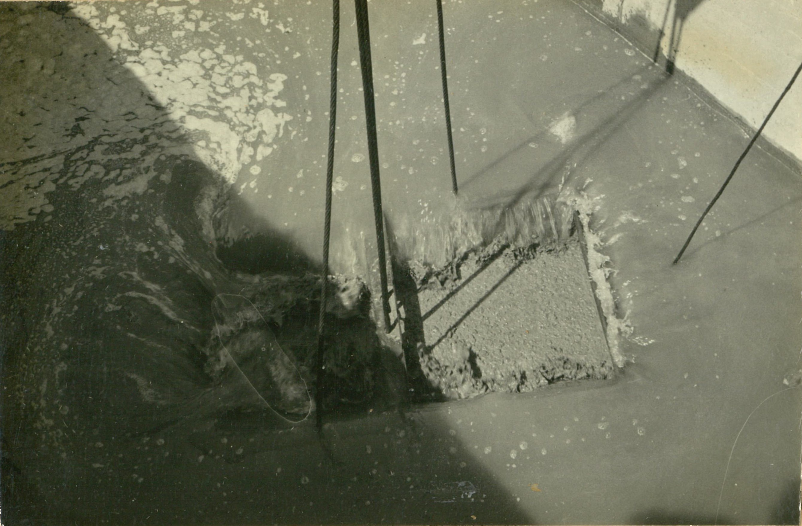 説明井筒底部6米(水深30米)を、コンクリート施工、下部3米を水中上部3米をドライ施工した。写真17は3立方米底開バケツトが潜水する時。