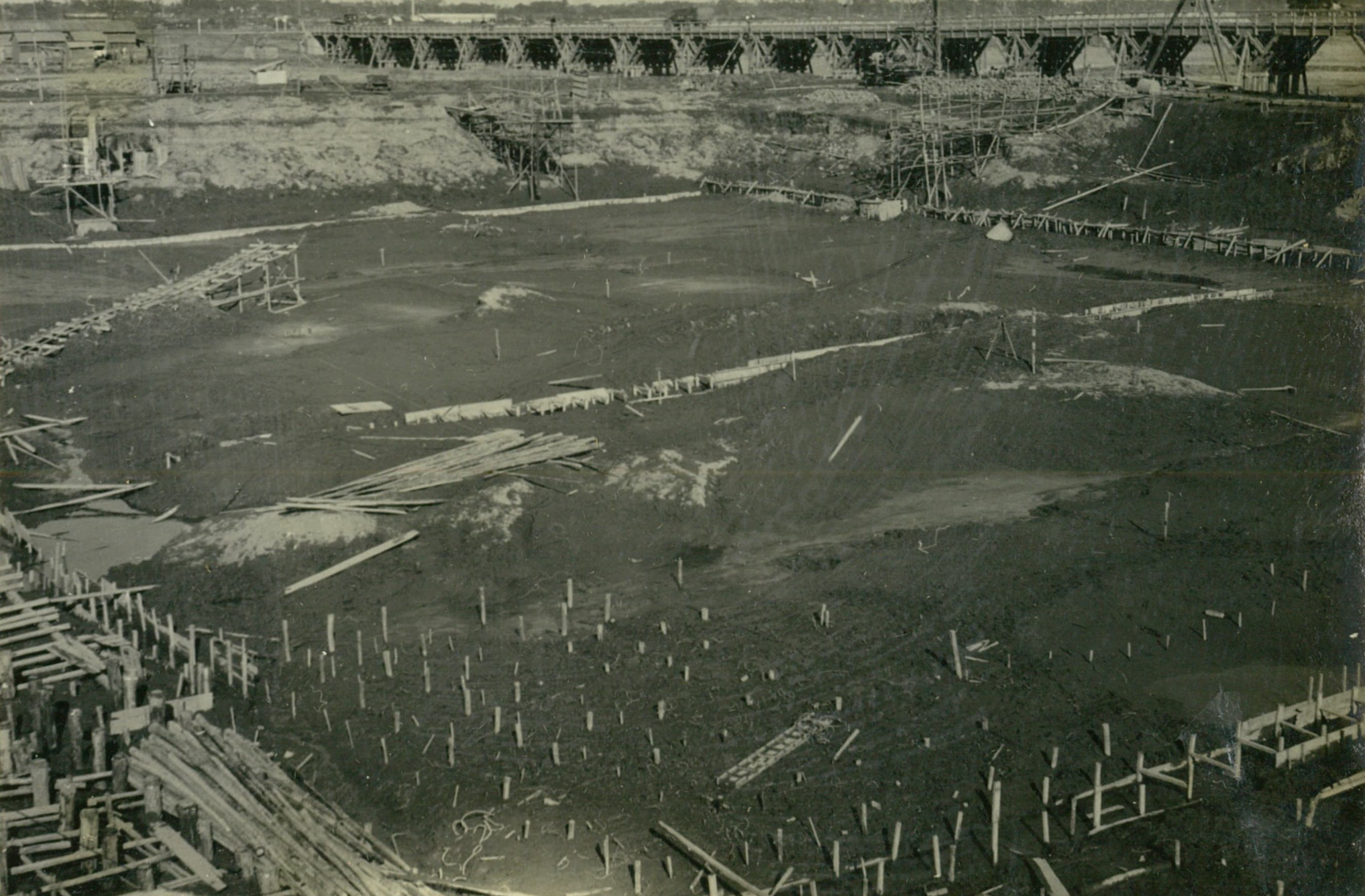 説明匁先高YP-17米附近は特に地質が軟弱(粘土)で、堀削途中一瞬に6米も沈下し、地表下1米潜つて了つた。