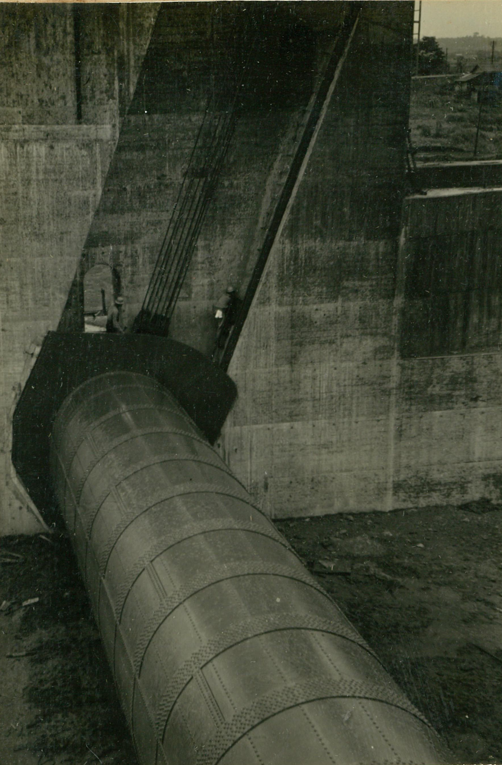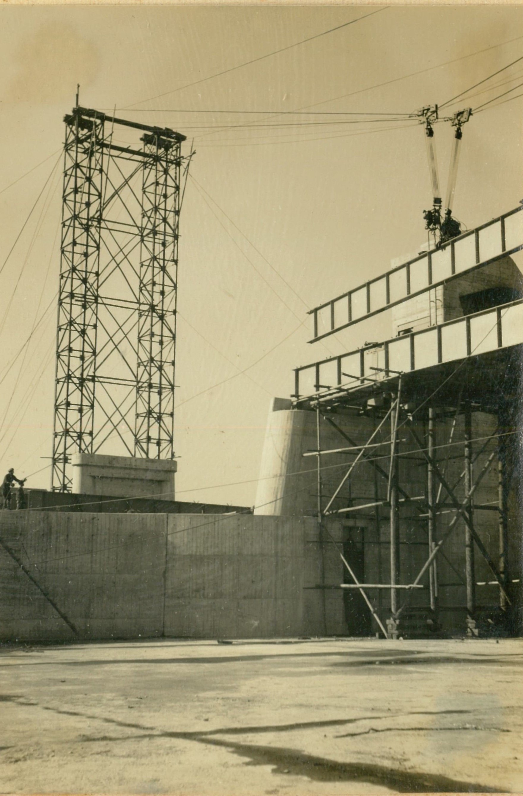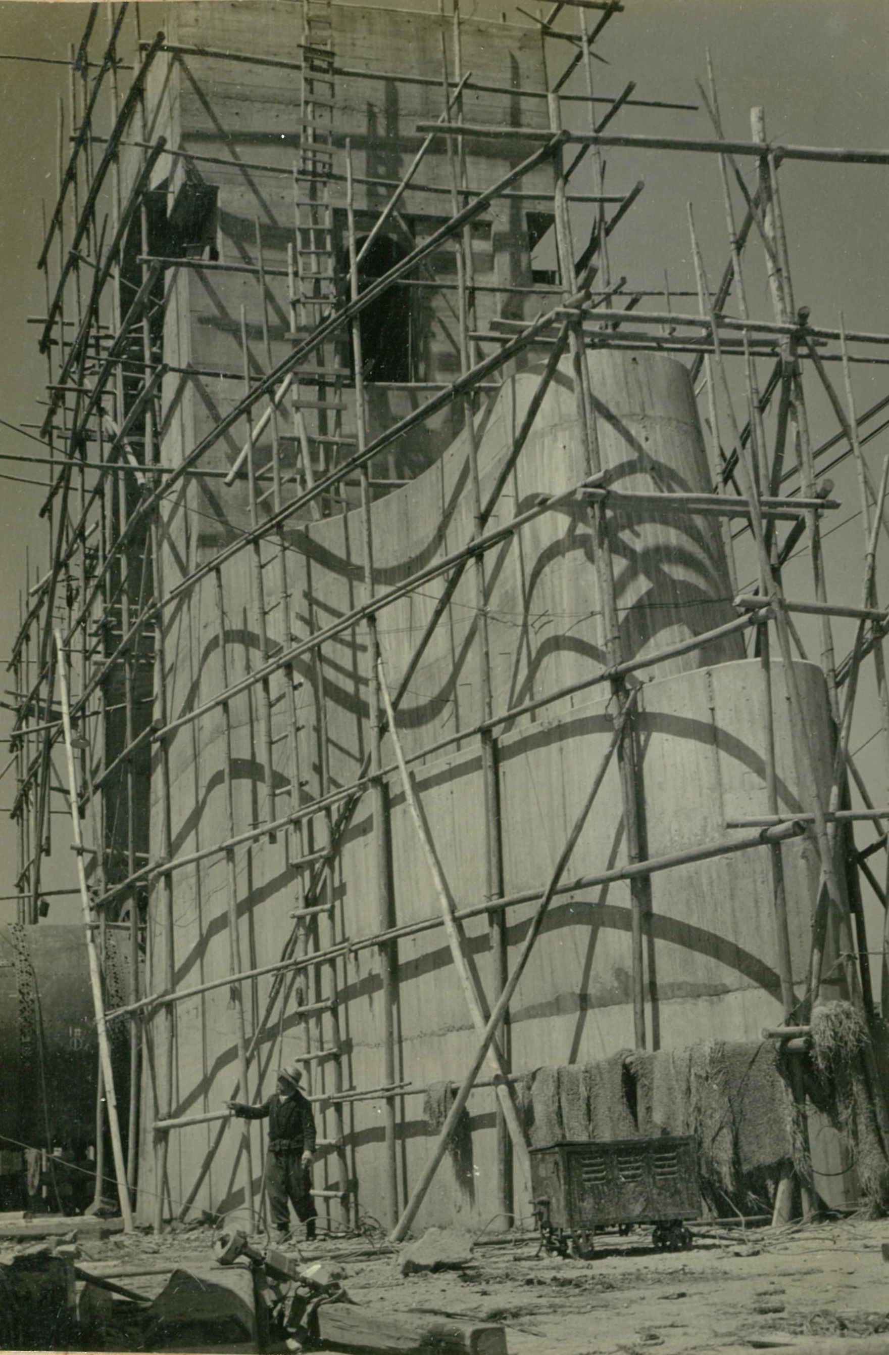 説明堰柱上部施工中、冷い風、高い所ぱ寒かつた。高17米。