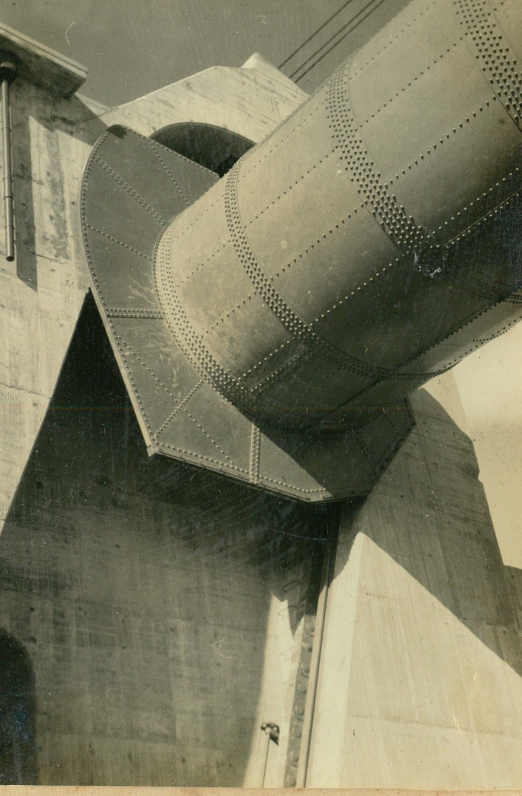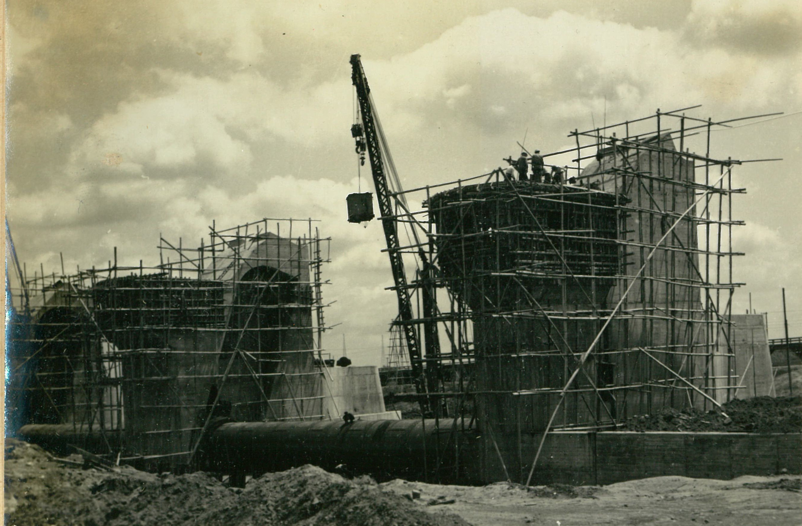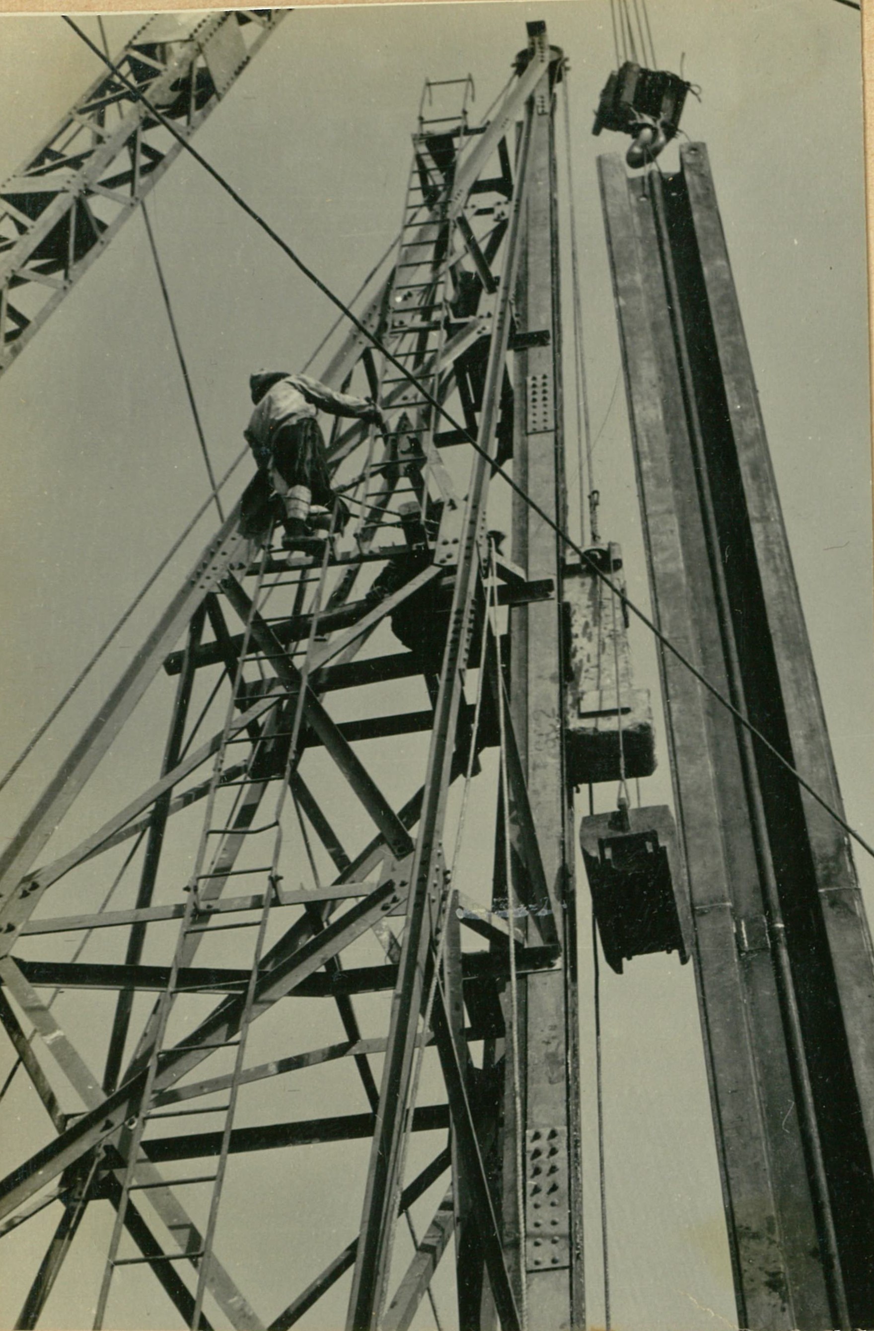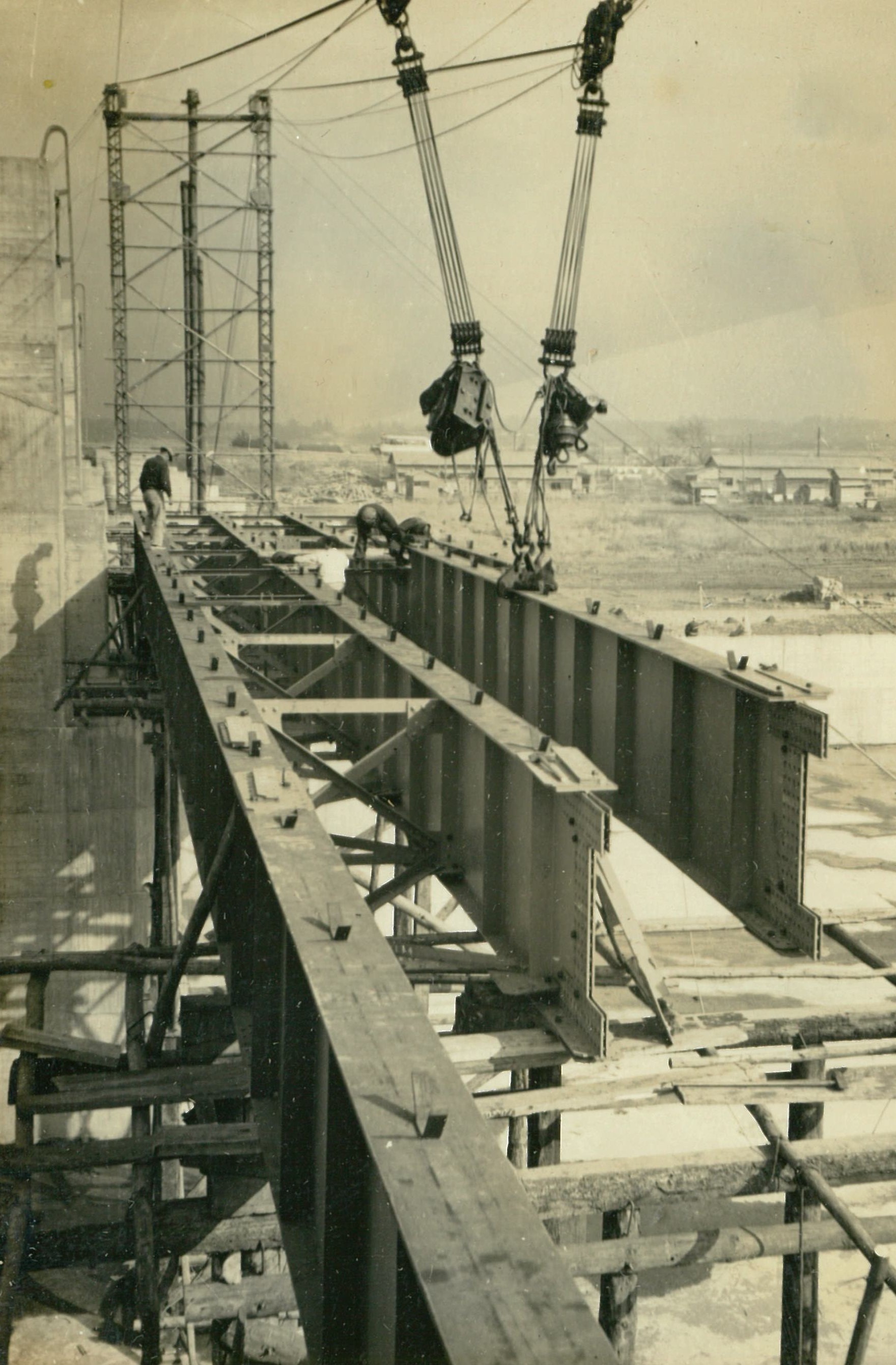 説明堰柱上部施工中、冷い風、高い所ぱ寒かつた。高17米。