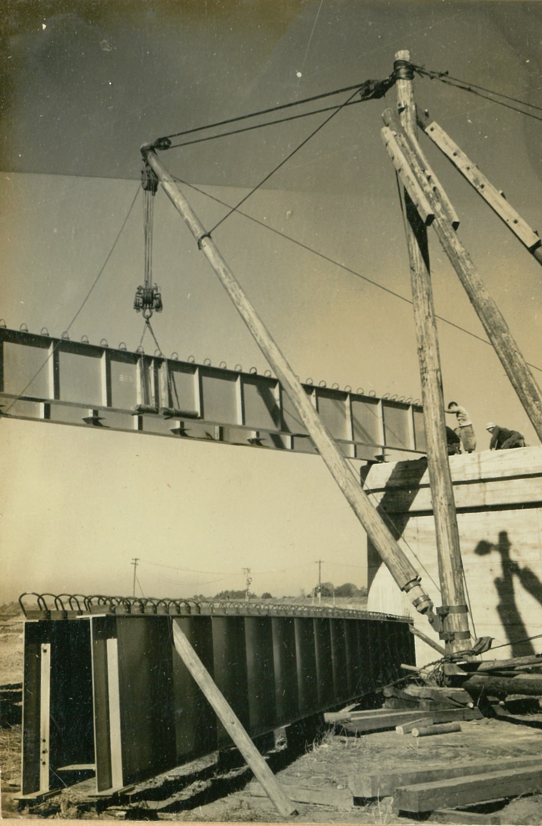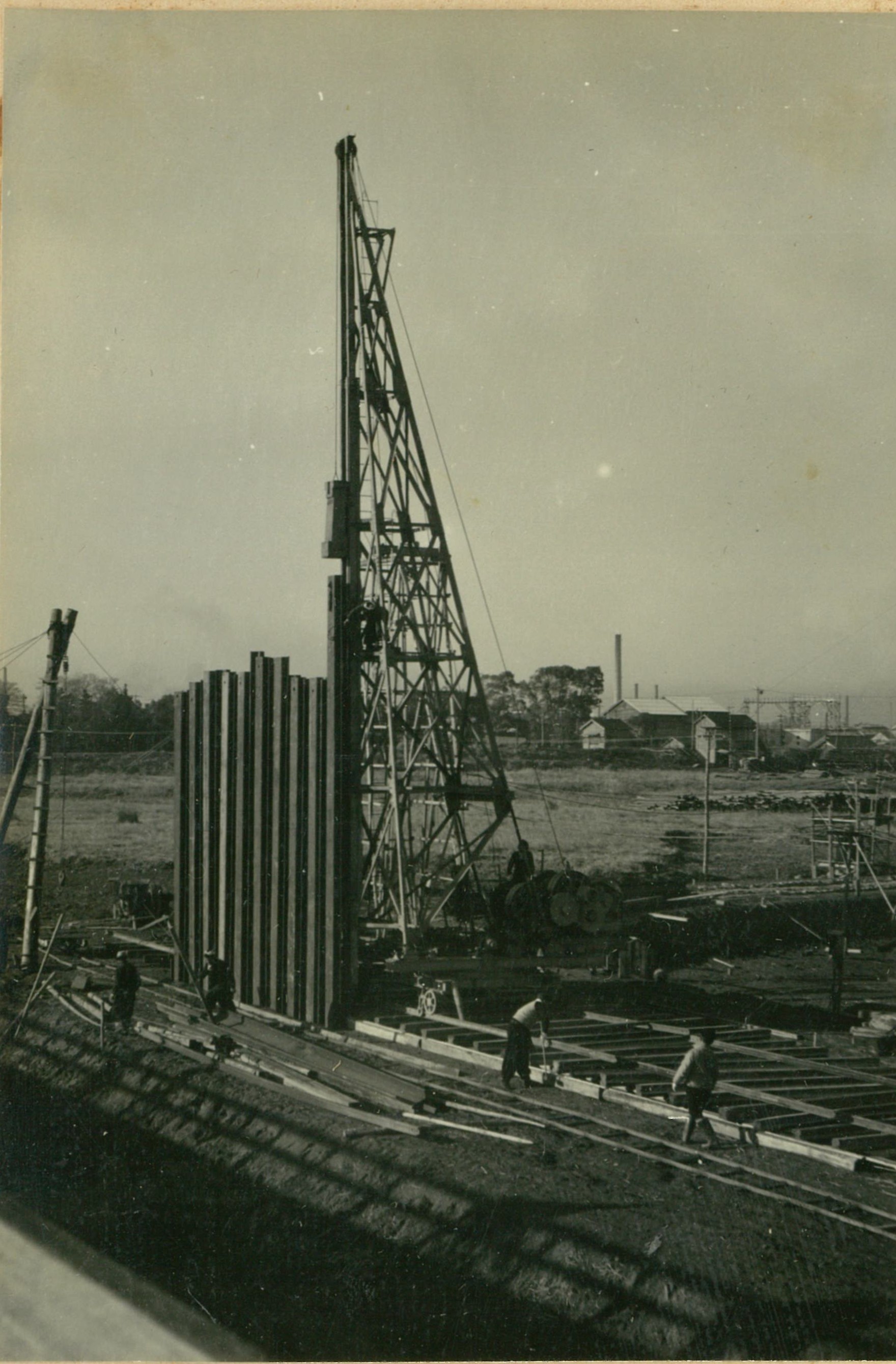 説明遮水壁用鋼矢板360米施工中、長15米のクルツプ型の吊込。吊込はガイデリツク使用し、打込には、ドイツ式鋼製櫓使用。