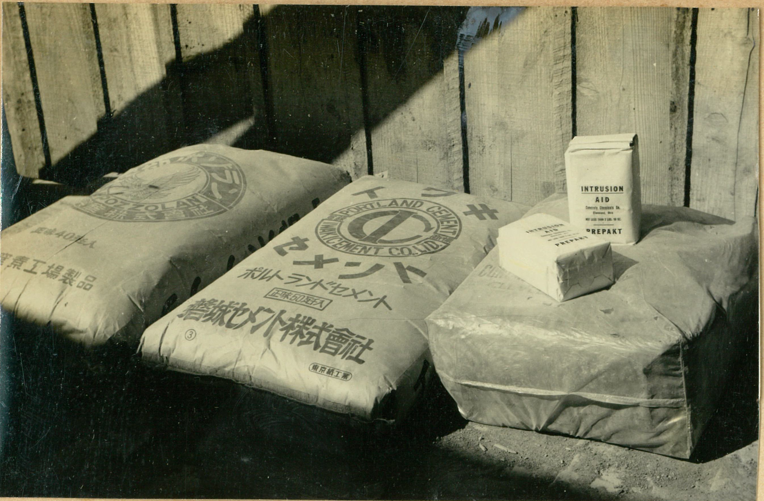 説明左より宇部ポゾラン(40瓩)盤城普通ポルトランドセメント(50瓩)イントルージヨンニイド(1.19瓩)