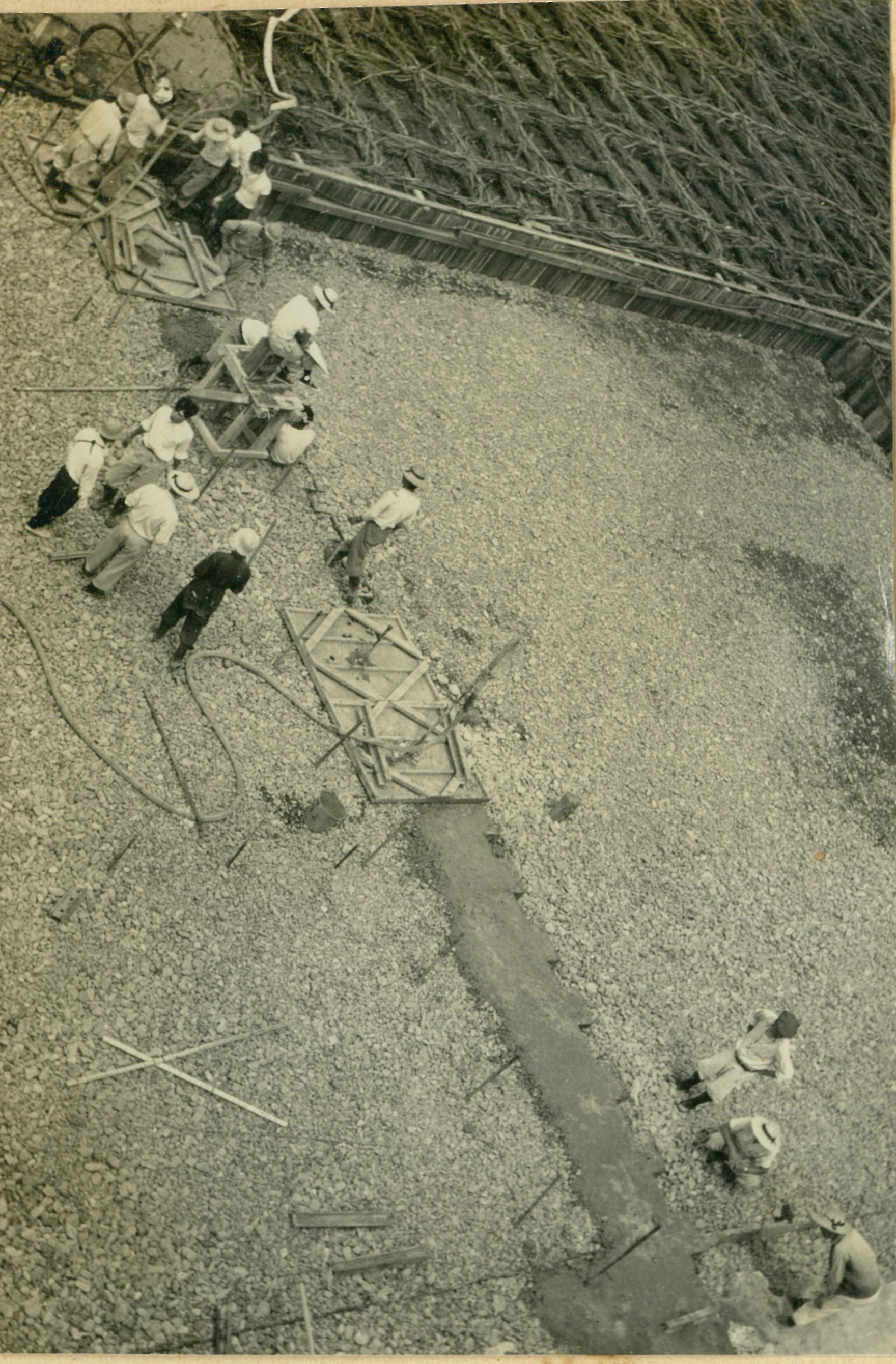 説明最適含水比に近づけ、敷砂利5糎より搗固め(80kgラムマー)表層地盤改良を行う。プレパクトコンクリート用砂利投入開始。