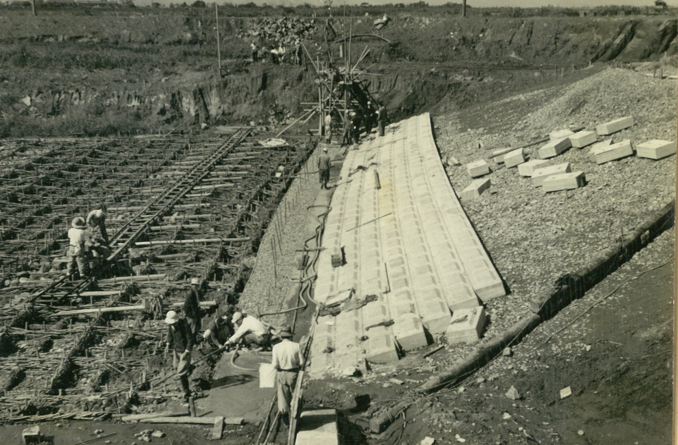 説明上流側床固(厚90糎) コンクリートの基礎地盤改良のため縦横に排水溝を設ける。