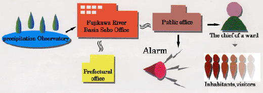 | The Fujikawa River Basin Sabo Office is working on the "Comprehensive Sediment Disaster Preventive Measures" in which they are to predict occurrence of debris flows from precipitation,enabling a municipal corporation to take prompt action for evacuation. |