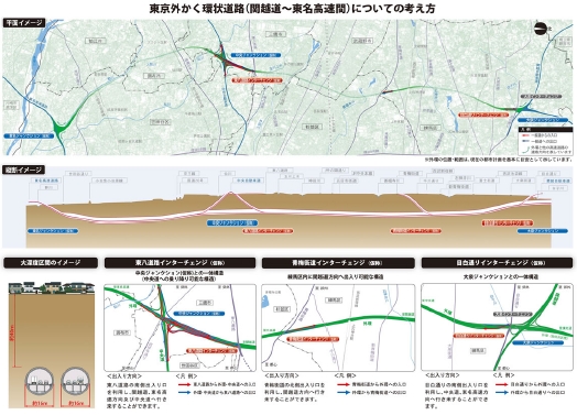 外環本線は、現在の都市計画の位置を基本として、極力、大深度地下を活用し、既存の高速道路(関越道、中央道、東名高速)とはジャンクションで接続する案とする。