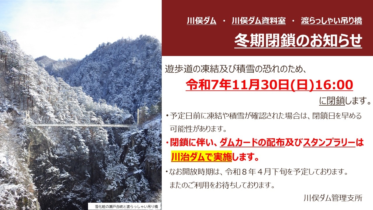 - 川俣ダム・川俣ダム資料室・渡らっしゃい吊り橋 冬期閉鎖のお知らせ
