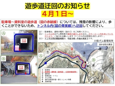 令和8年4月1日より、川俣ダム・ダム資料館・渡らっしゃい吊橋がオープンしますのでお知らせします。 なお駐車場~資料室までの遊歩道は残雪の影響により歩くことができないため、トンネル内を歩いてください。 駐車場~資料室の遊歩道開放については川俣ダムX(https://x.com/mlit_kawamata_D)にて周知します。 開放期間:令和8年4月1日(水)~11月下旬 開放時間:9:00~16:00