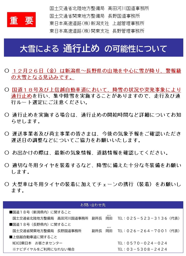 12月26日(金)は新潟県~長野県の山地を中心に雪が降り、警報級の大雪となる見込みです。 国道18号及び上信越自動車道において、降雪の状況や突発事象により通行止めを行い、集中除雪を実施することがありますので、走行及び通行ルート選定にご注意ください。 通行止めを実施する場合は、通行止めの開始時間など詳細についてお知らせします。