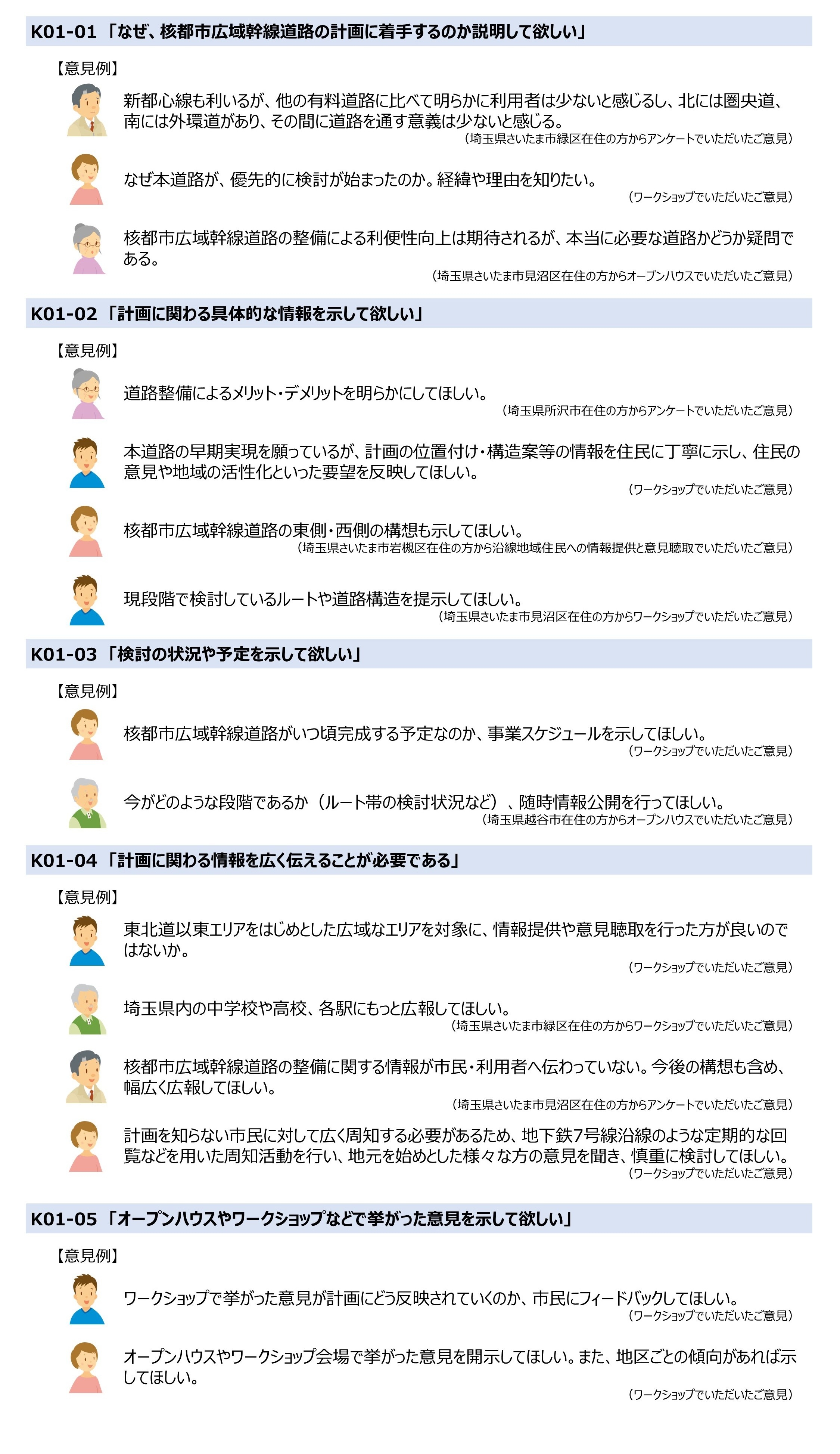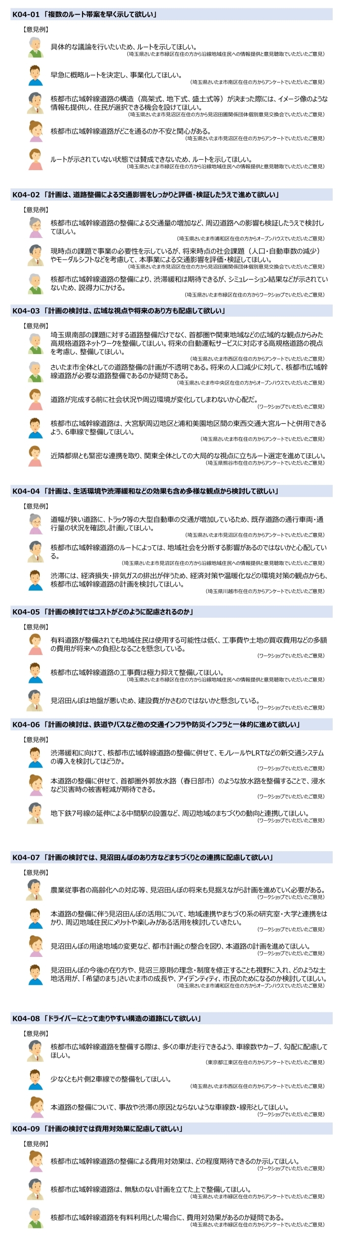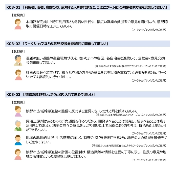 ・複数のルート案の提示、交通影響の評価、他の交通インフラとの一体整備などのご意見がありました。
