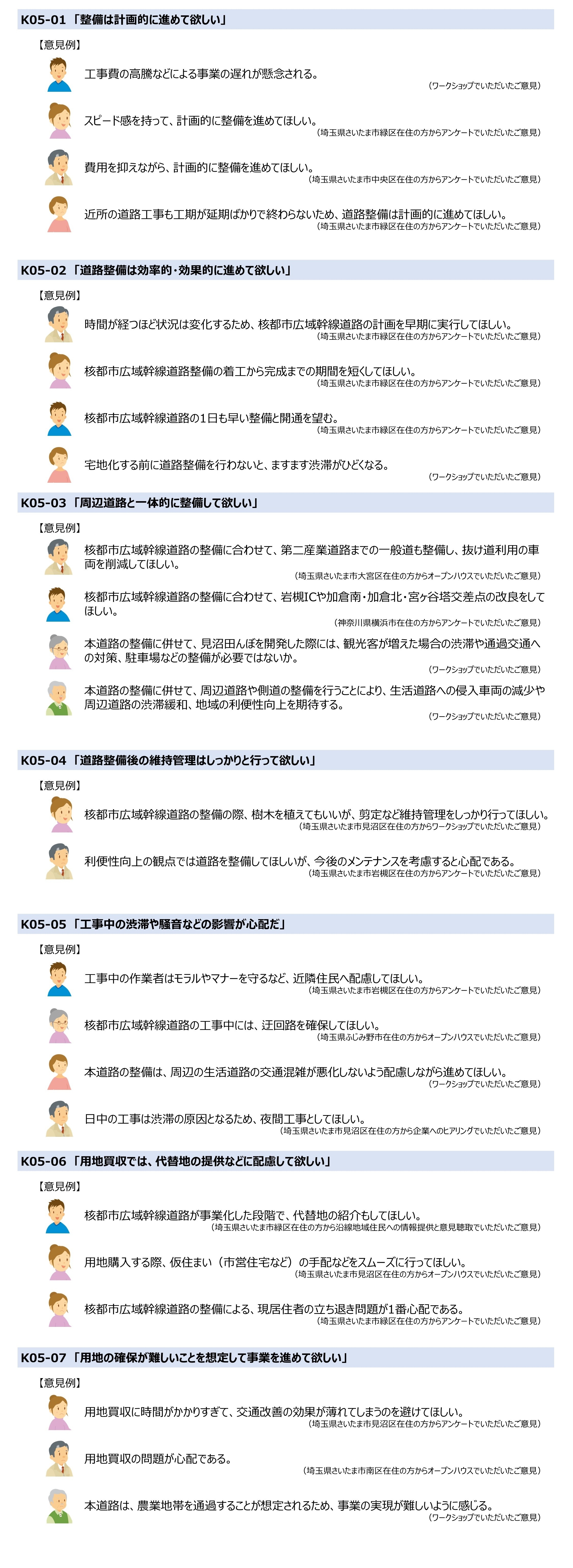 ・効率的・効果的な道路整備、周辺道路との一体的な整備、維持管理の徹底、用地買収時の配慮などのご意見がありました。