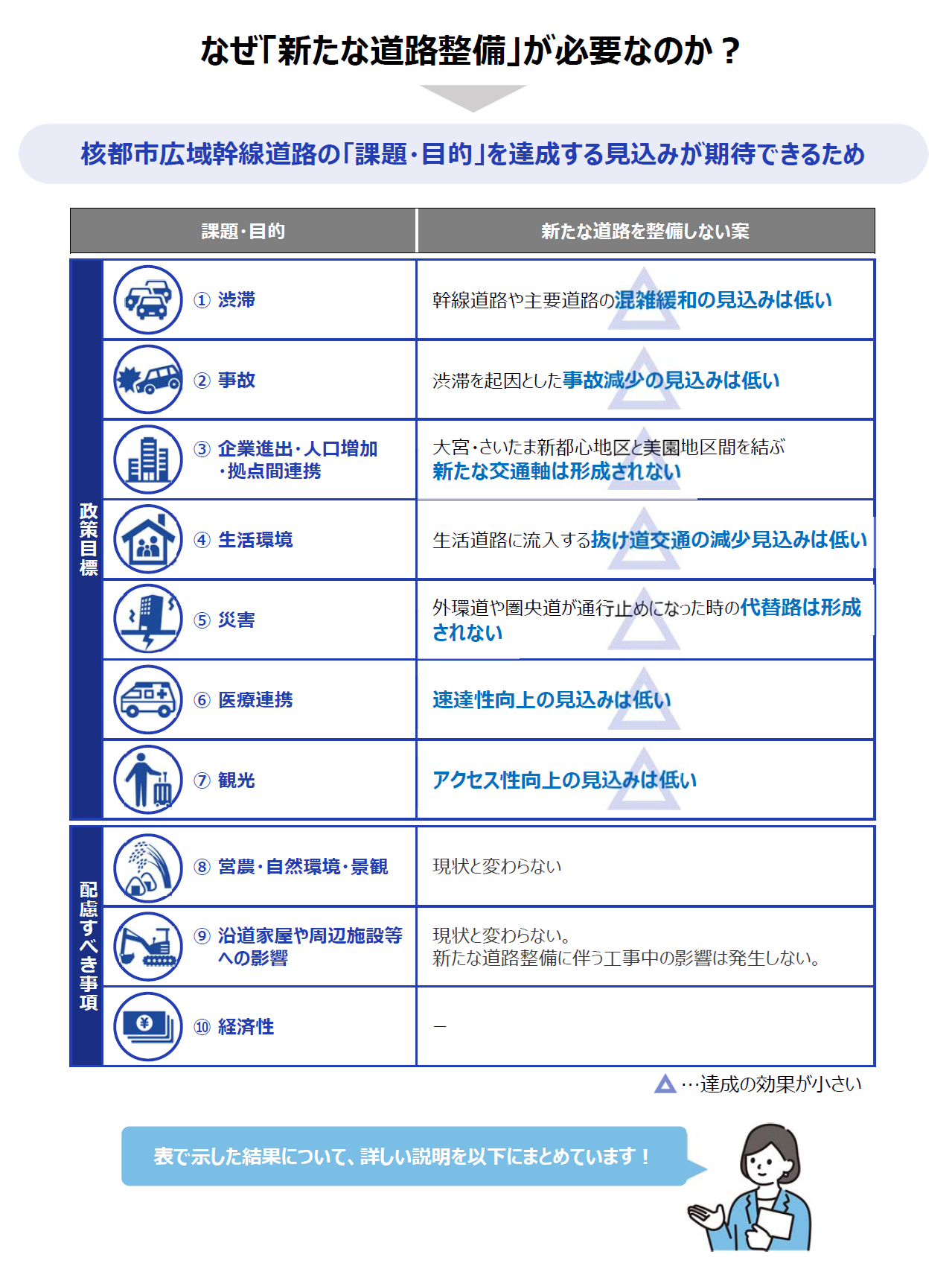 ・確認の結果、新たな道路を整備しない場合では、渋滞や事故をはじめとした「課題・目的」を達成する見込みが低いことから、「新たな道路整備が必要である」と結論づけました。