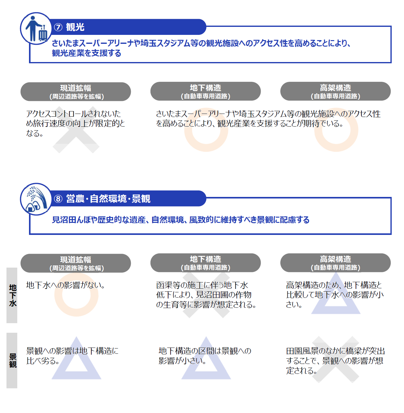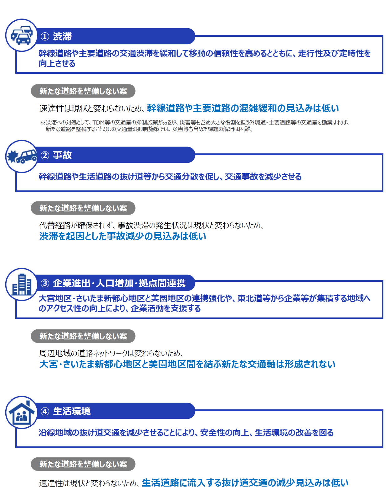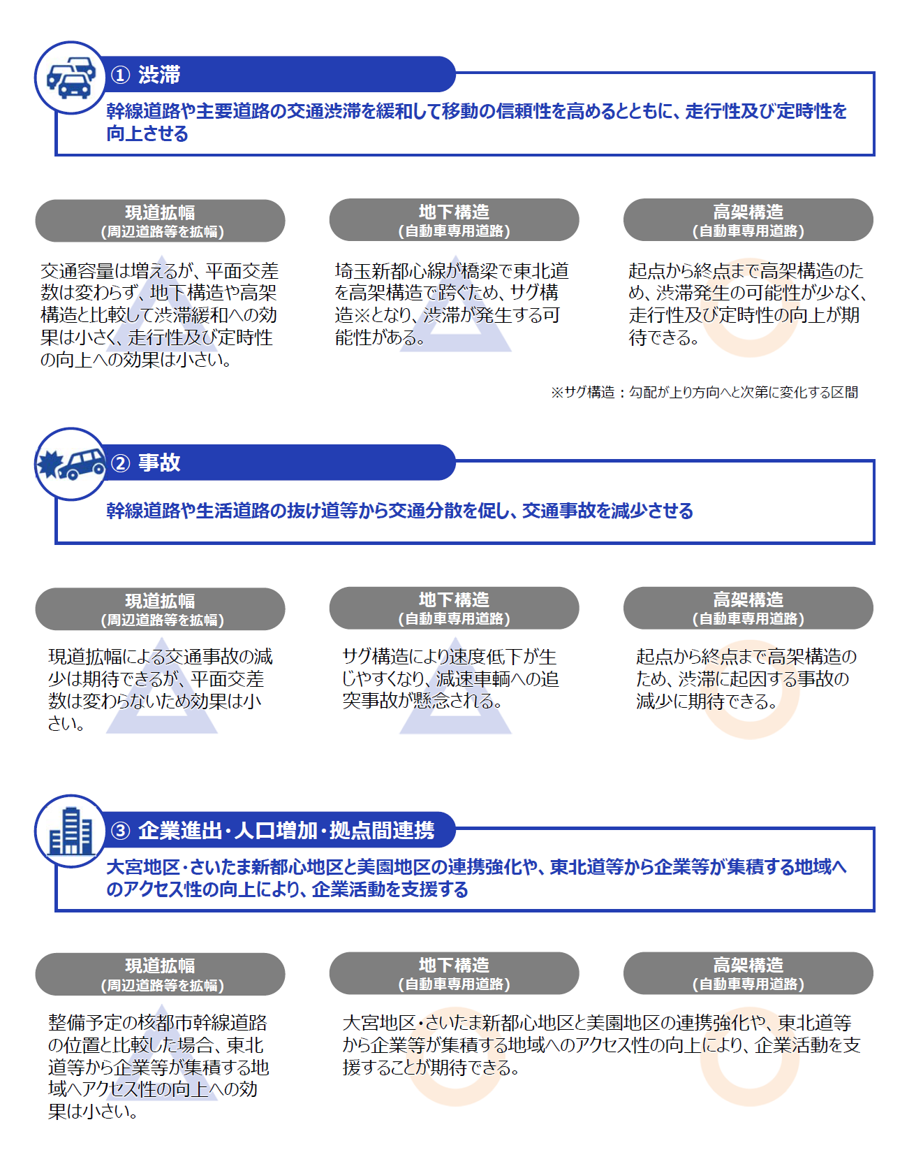 ・地下構造案では、埼玉新都心線が橋梁で東北道を効果構造で跨ぐため、サグ構造となり、渋滞緩和や事故減少への効果が小さくなります。