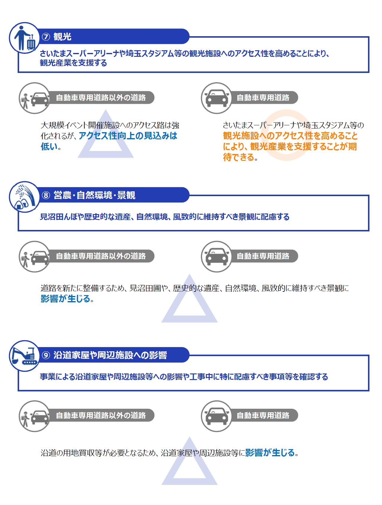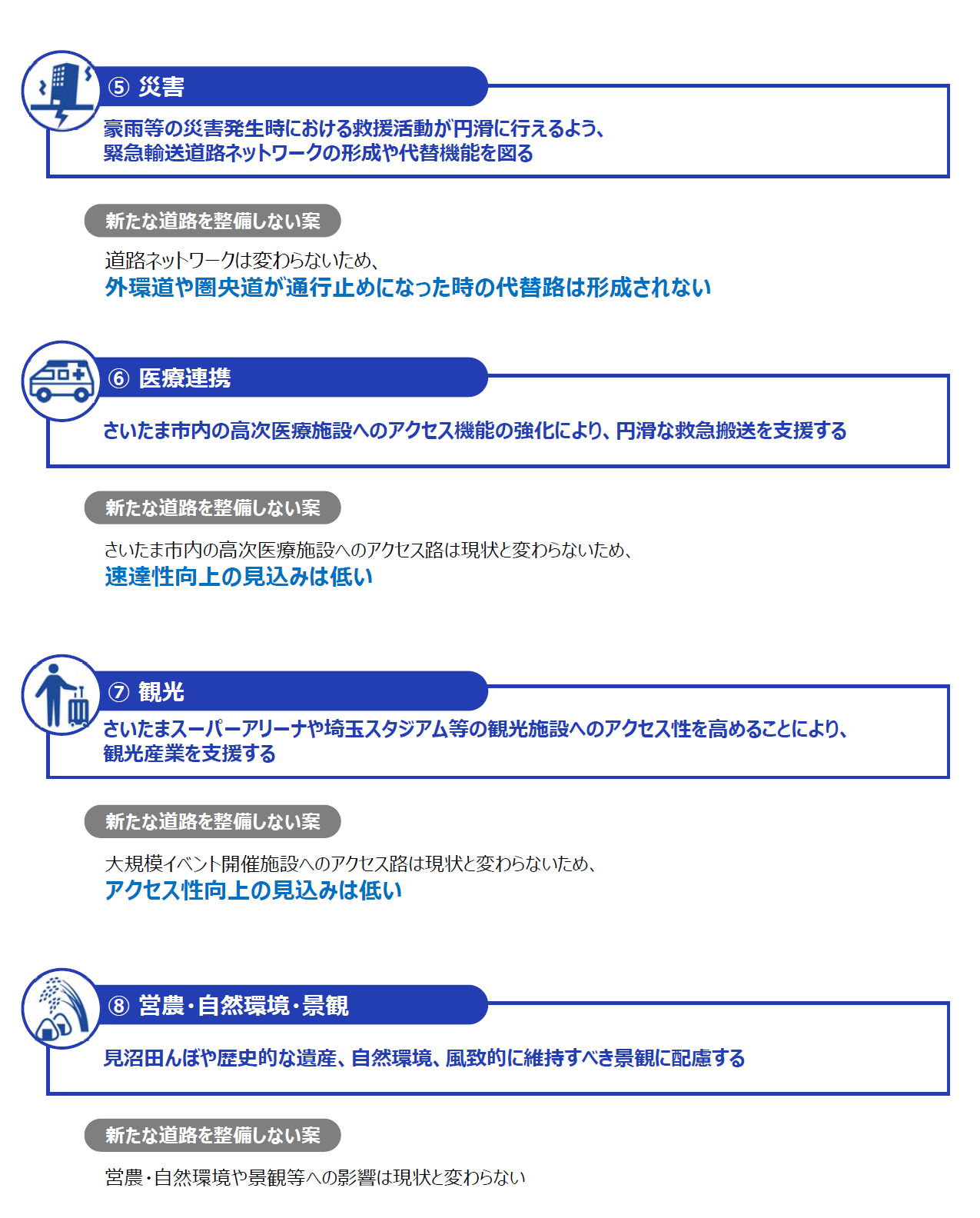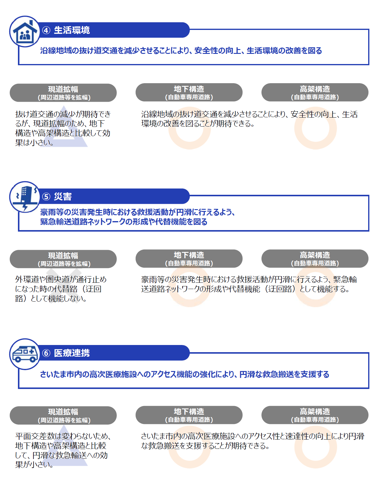 ・地下構造案では、埼玉新都心線が橋梁で東北道を効果構造で跨ぐため、サグ構造となり、渋滞緩和や事故減少への効果が小さくなります。
