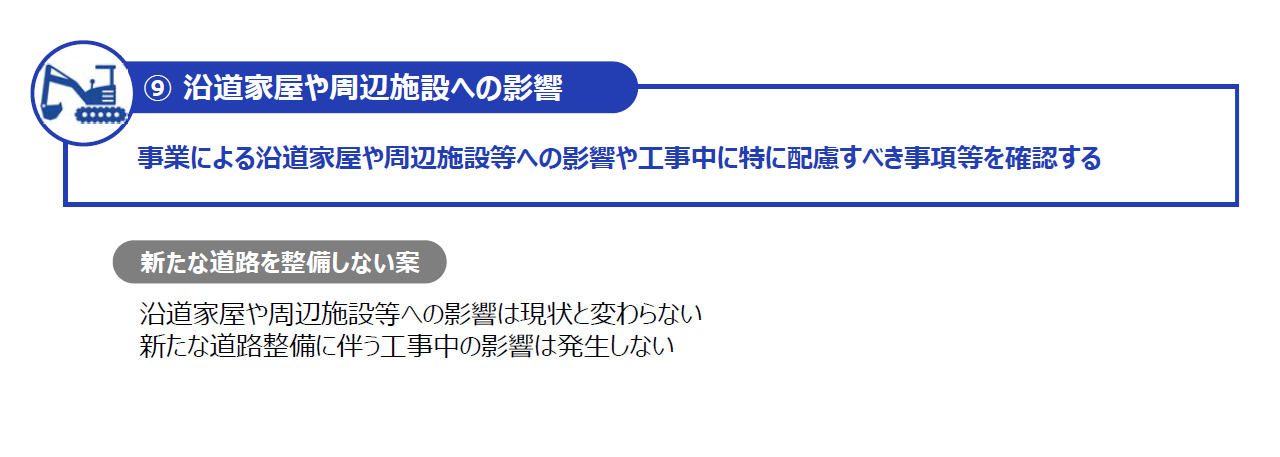 ・「新たな道路を整備しない案」は、複数案の設定において、比較評価のベースラインとして提示します。