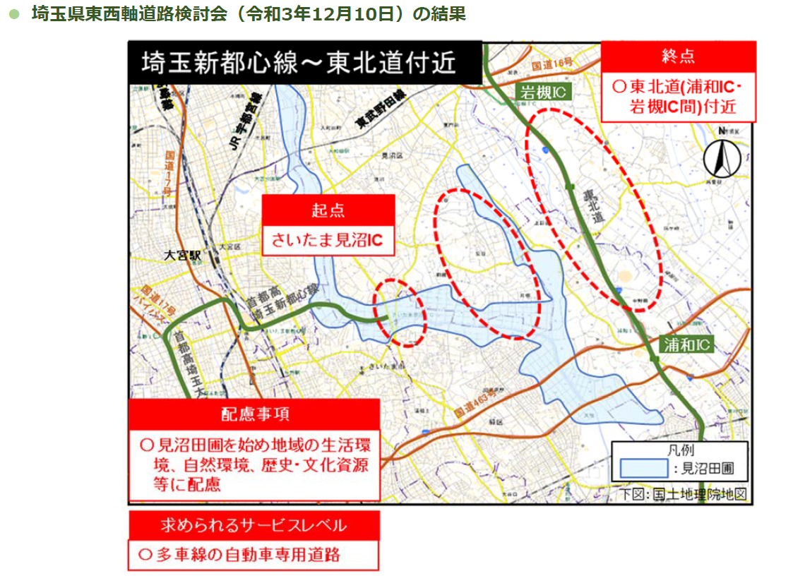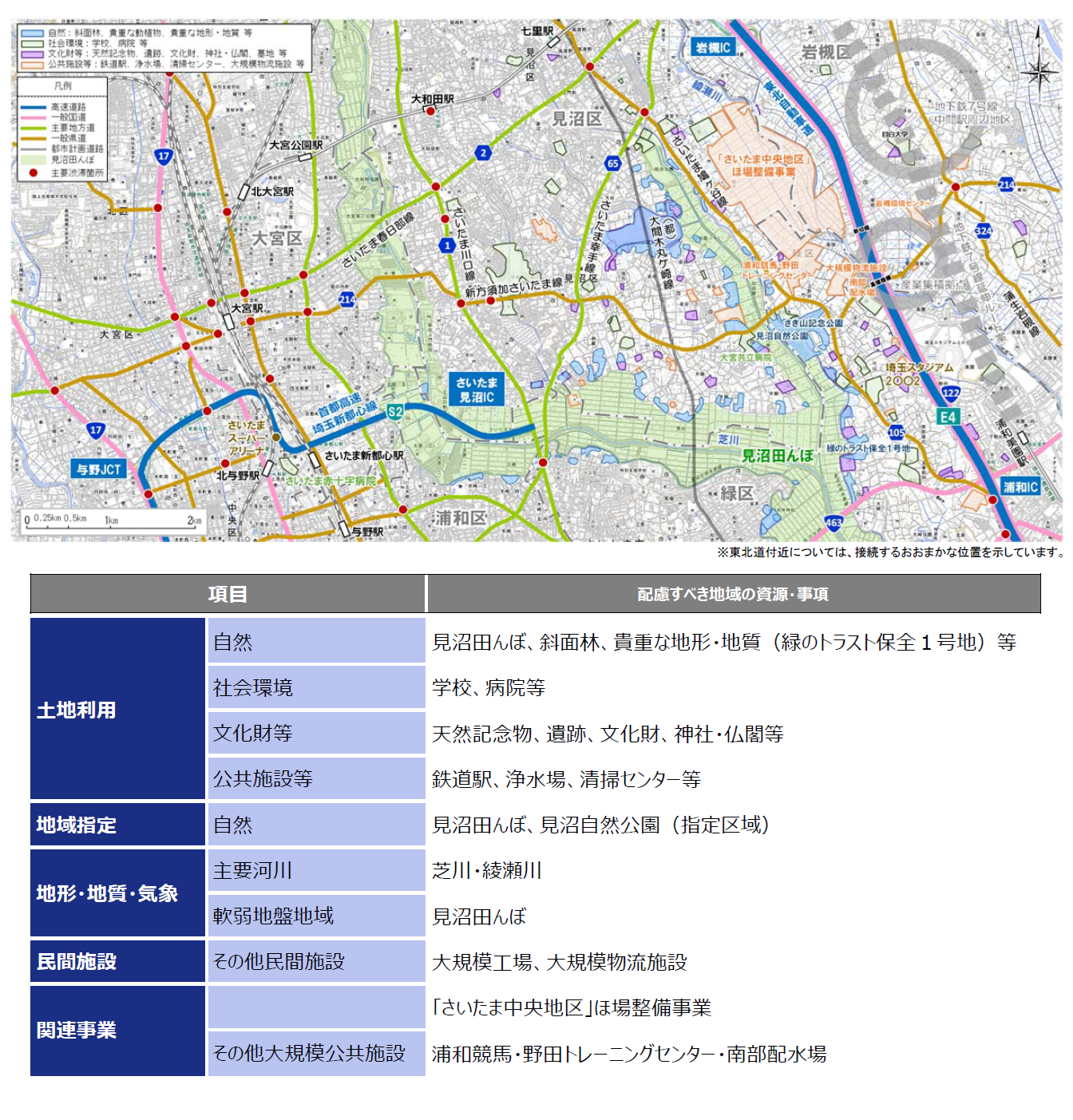 ・核都市広域幹線道路(埼玉新都心線~東北道付近)の沿線地域には、環境等への配慮が必要な見沼田んぼをはじめ、住宅地が集中する地域や文化財、神社・仏閣、医療施設、文教施設等が点在します。