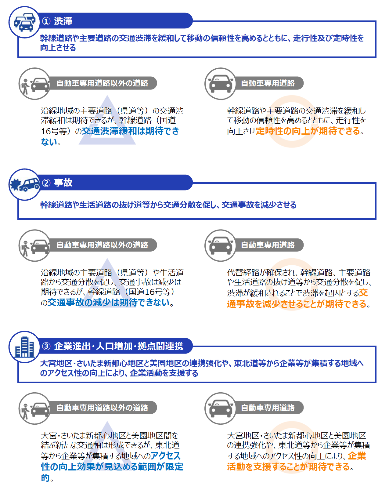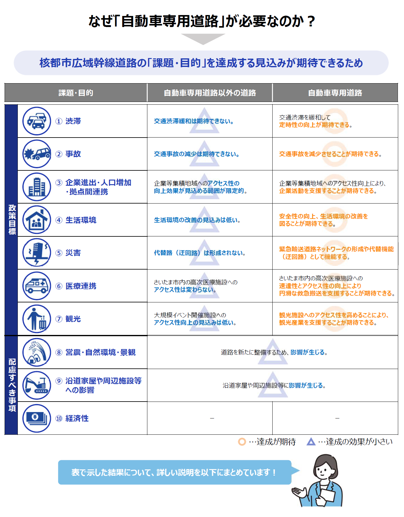 ・確認の結果、 「自動車専用道路案」では渋滞や事故をはじめとした「課題・目的」を達成する見込みが期待できることが確認されました。