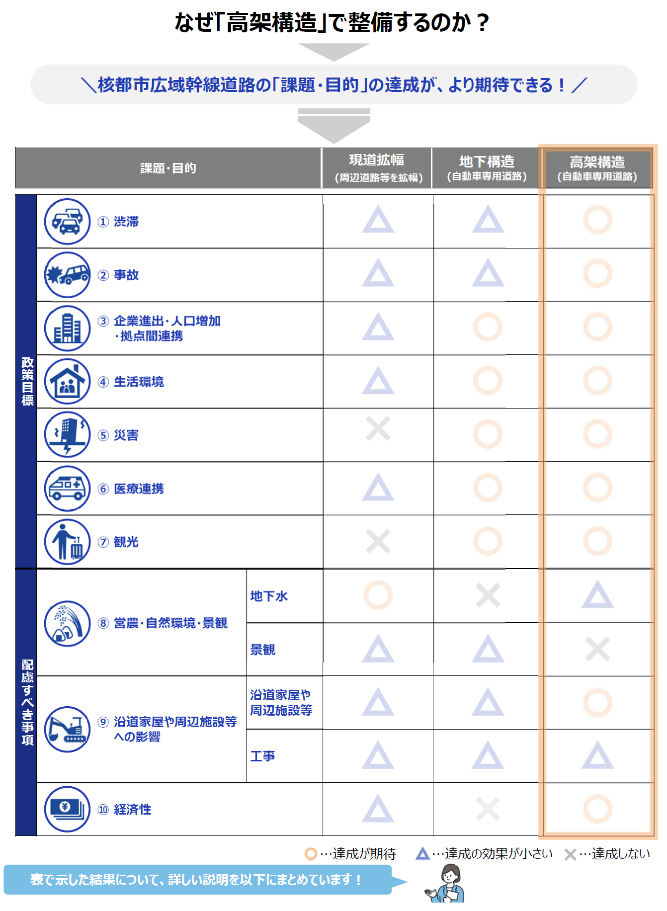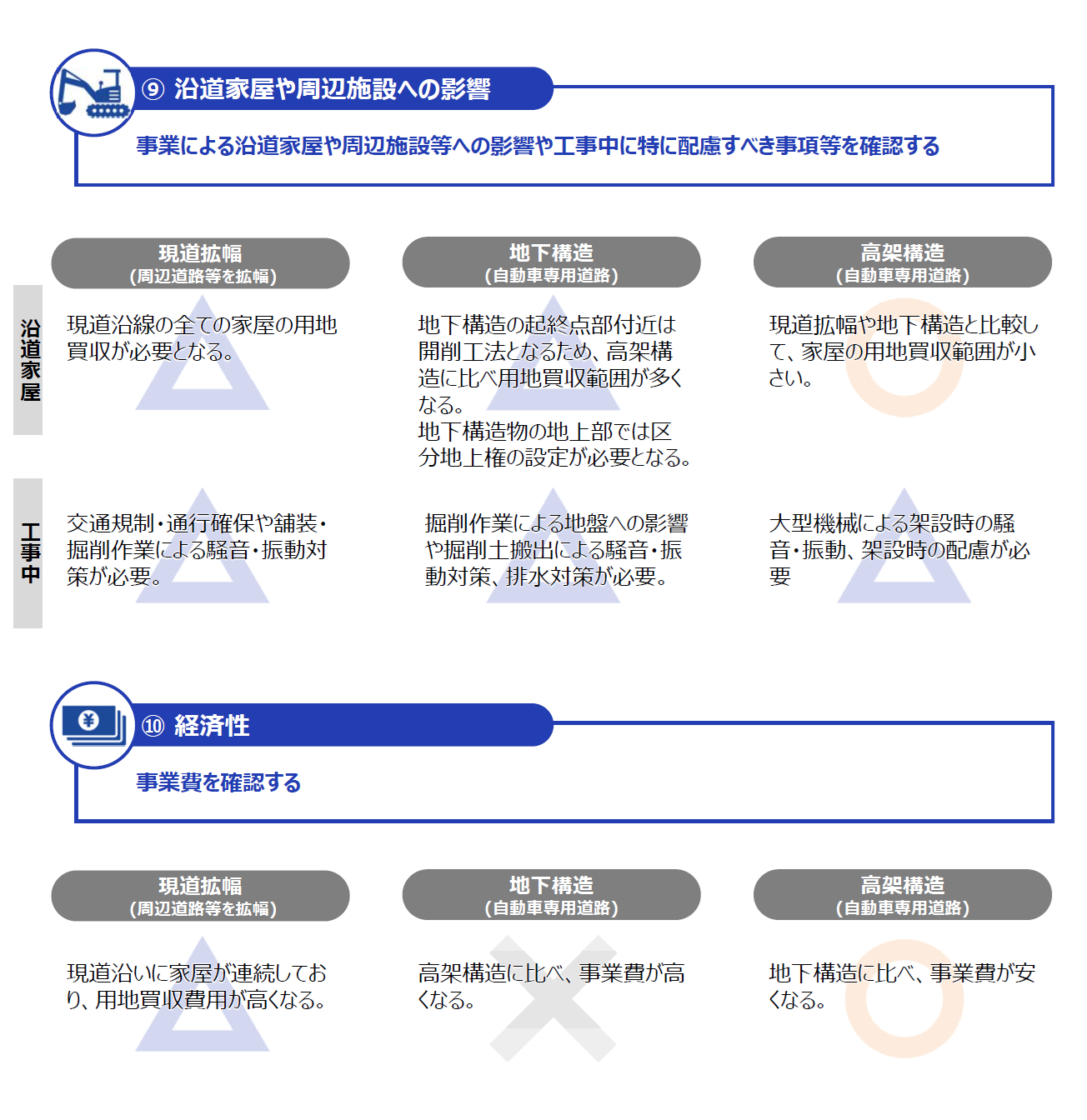 ・複数案について、課題・目的を踏まえて、「現道拡幅案」「地下構造案」「高架構造案」の中から望ましい道路構造を検討しました。