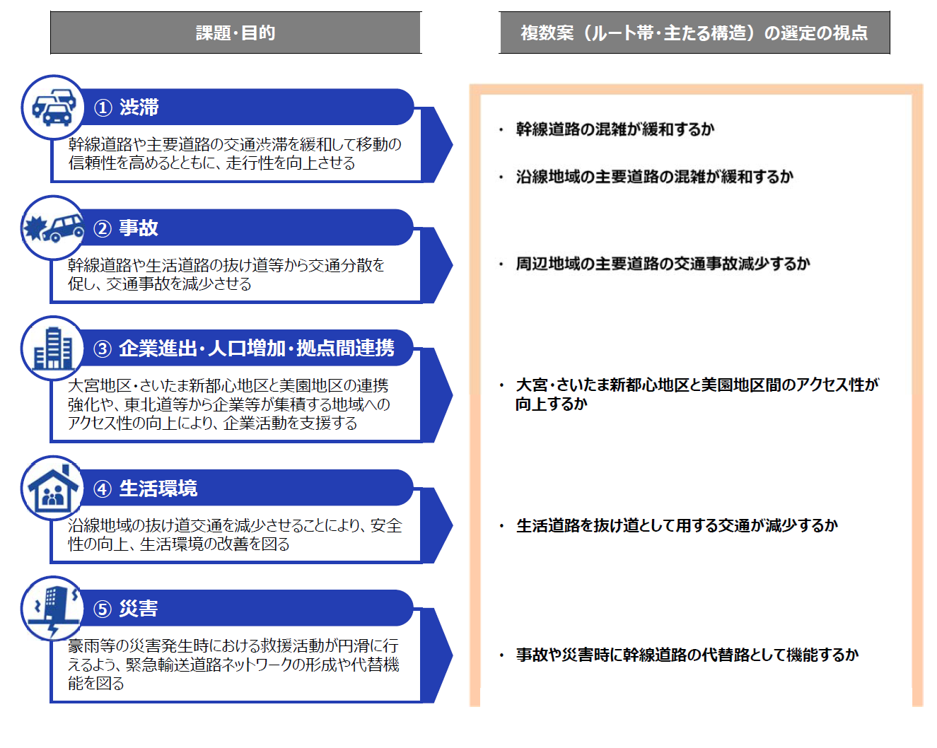 ・『課題・効果の把握』で確定した「課題・目的」を踏まえ、核都市広域幹線道路(埼玉新都心線~東北道付近)の主たる構造を確認しました。
