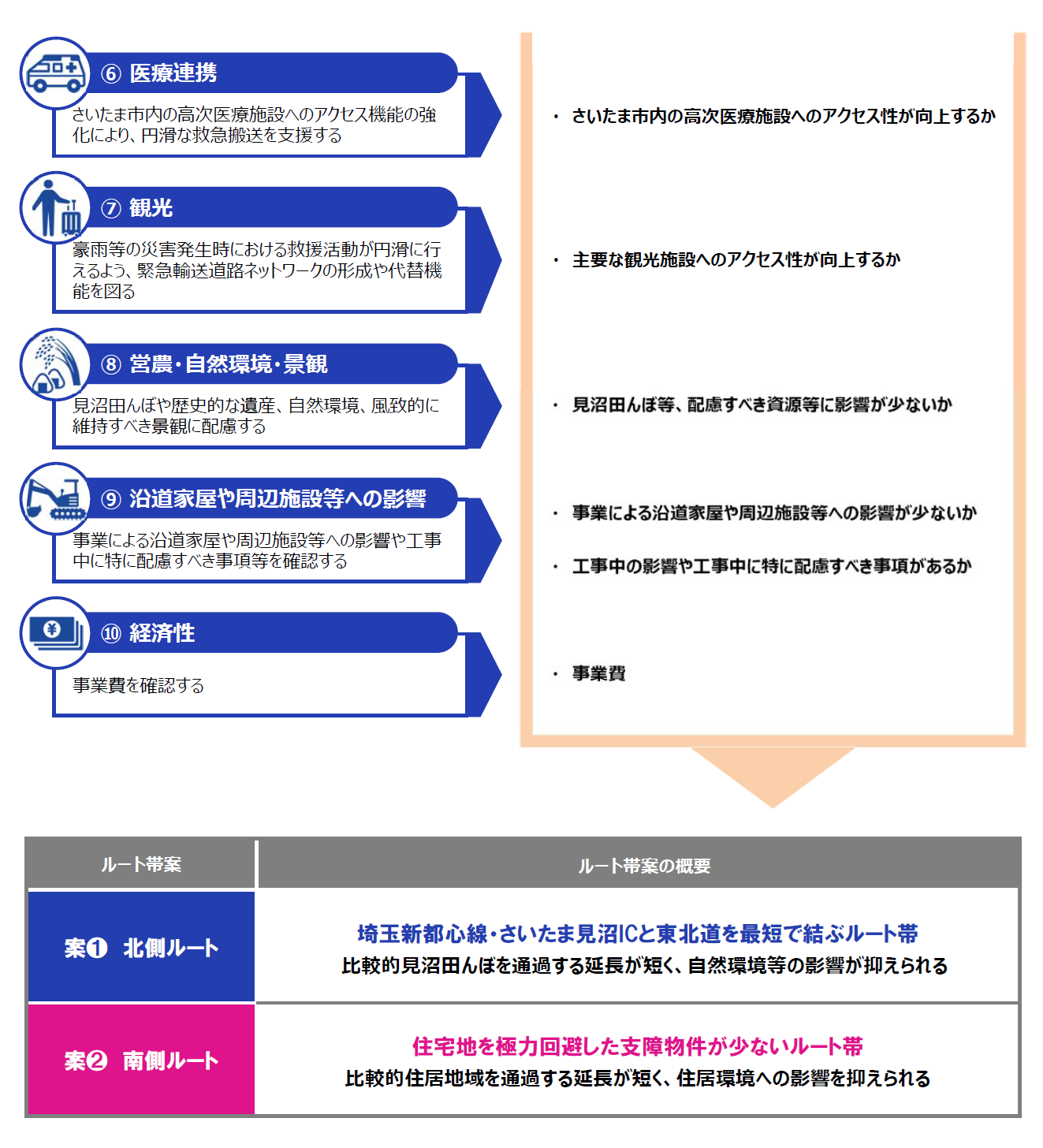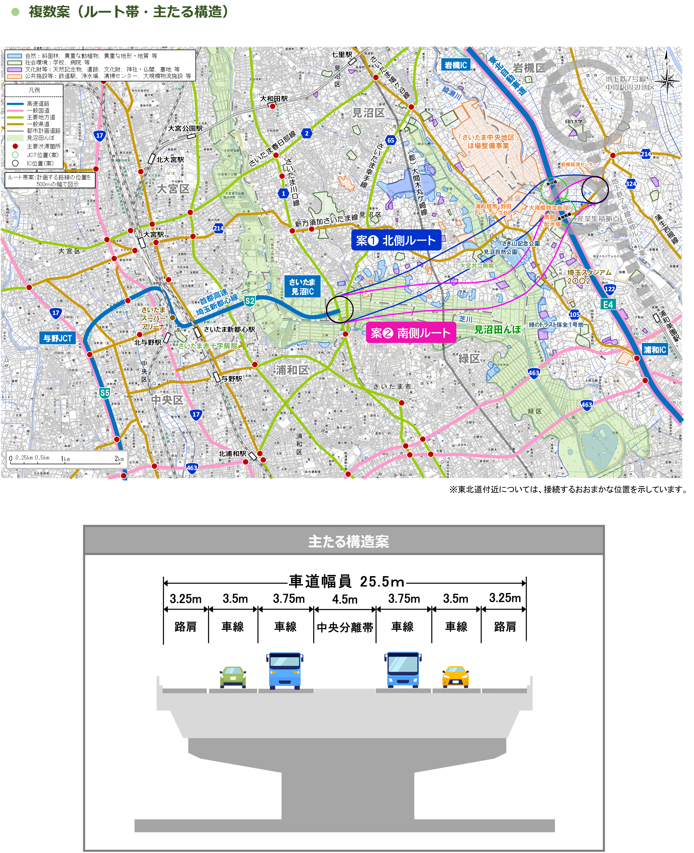 ・『複数案の提示』では、核都市広域幹線道路(埼玉新都心線~東北道付近)の「ルート帯」と「主たる構造」について検討しました。