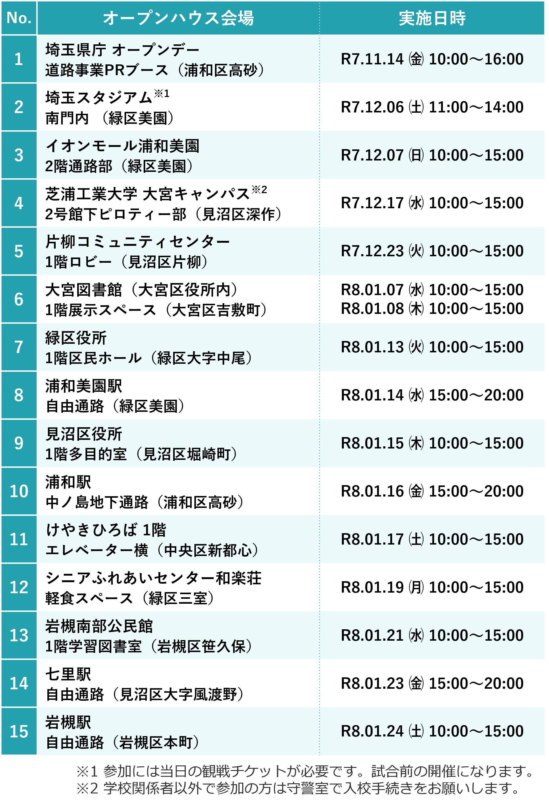 ・核都市広域幹線道路(埼玉新都心線~東北道付近)について、令和7年11月14日(金)~令和8年1月24日(土)の間、さいたま市内を中心に計15の施設でオープンハウスを開催します。