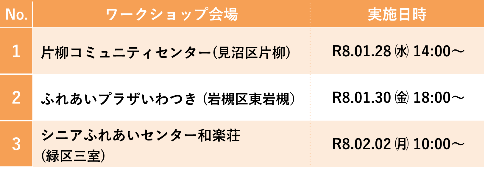 ・核都市広域幹線道路(埼玉新都心線~東北道付近)について、令和8年1月28日(水)~令和8年2月2日(月)の間、計3施設でワークショップを開催します。
