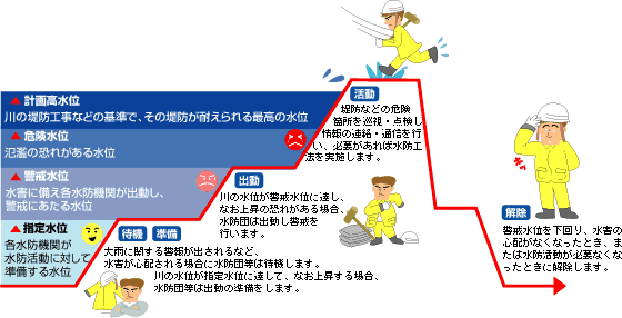 | 洪水により破堤等の災害や浸水被害の恐れがある水位。 危険水位に達する恐れがある場合には、水防団、関係行政機関および放送機関・新聞社等の協力を得て地域住民の方々へ洪水警報を発表します。 |