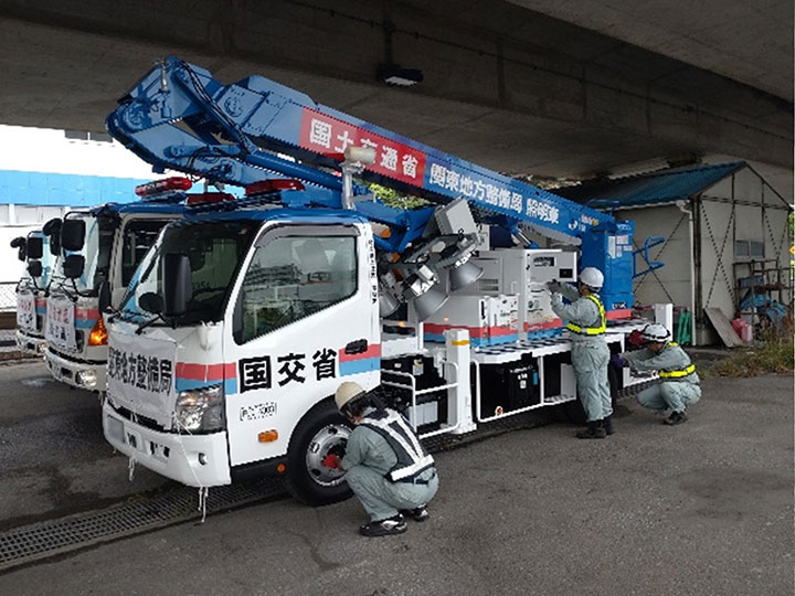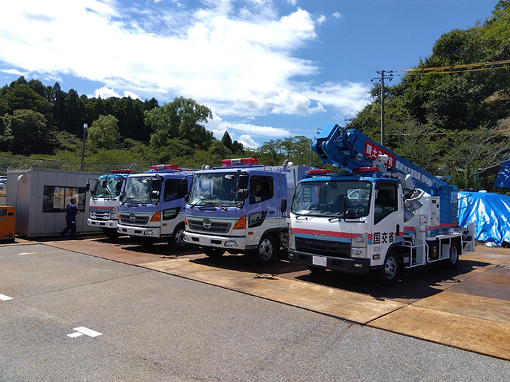 災害対策用機械(災害対策用ヘリ、排水ポンプ車、照明車、衛星通信車など)を管内に分散配備し、自然災害発生時には自治体からの支援要請にも迅速に対応することが可能な体制を構築しています。