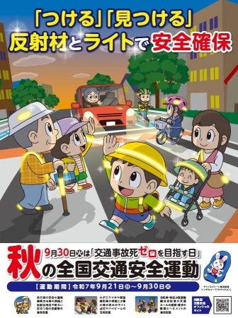 日暮れが早くなる季節です。運転者は早めのライト点灯、歩行者は反射材を身につけ、交通安全を推薦しましょう。