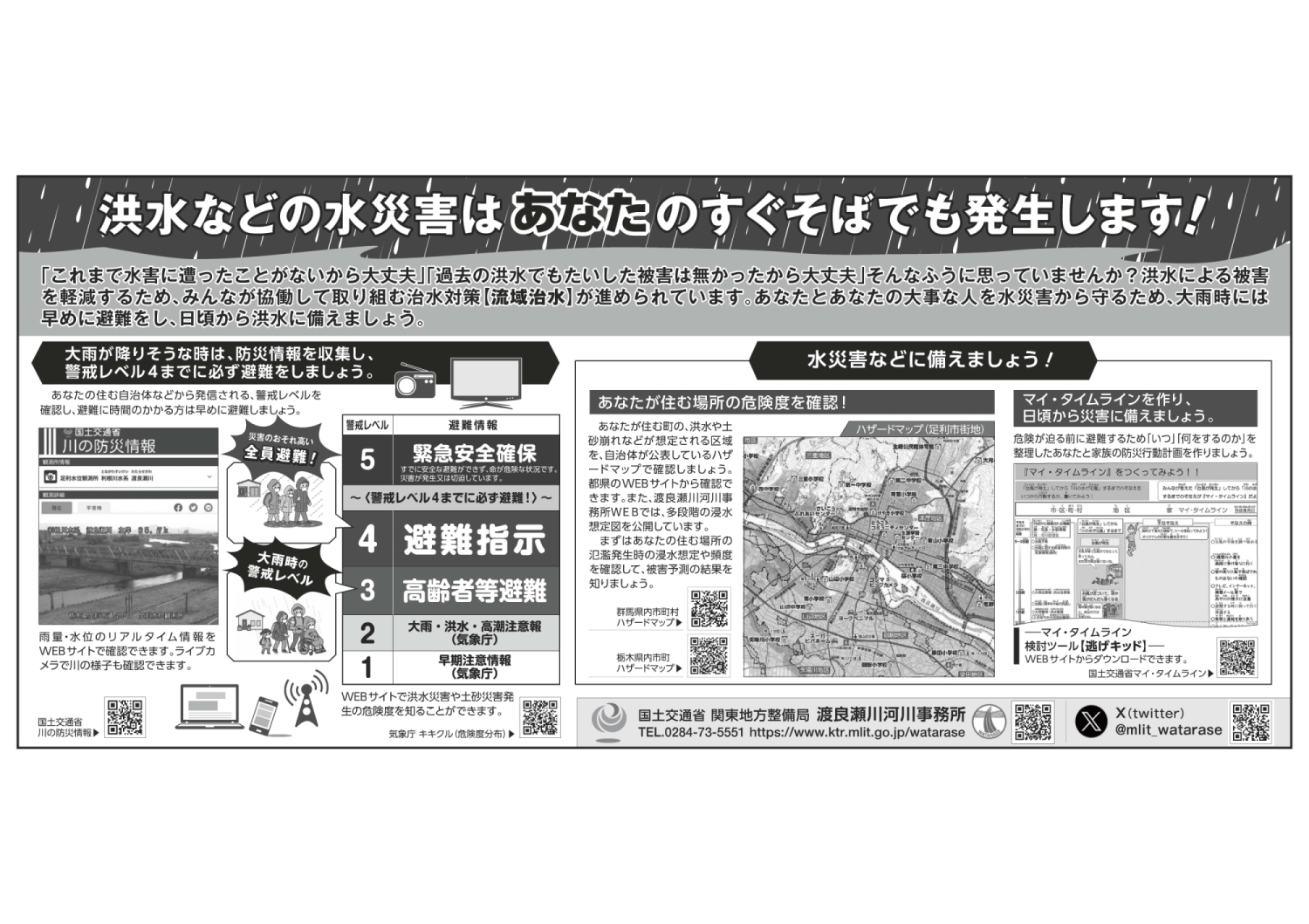 「これまで水害に遭ったことがないから大丈夫」「過去の洪水でもたいした被害は無かったから大丈夫」そんなふうに思っていませんか? 洪水による被害を軽減するため、みんなが協働して取り組む治水対策【流域治水】が進められています。 あなたとあなたの大事な人を水災害から守るため、大雨時には早めに避難をし、日頃から洪水に備えましょう。 ※令和7年8月13日(水) 下野新聞、上毛新聞に以下広告を掲載しました。